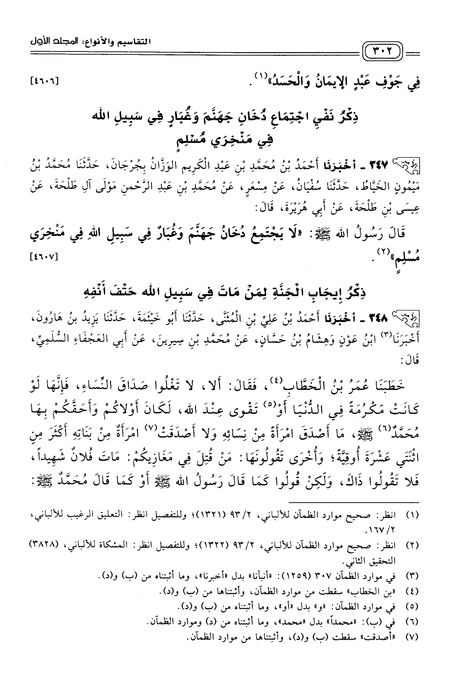 ذِكْرُ نَفْيِ اجْتِمَاعِ دُخَانِ جَهَنَّمَ وَغُبَارٍ فِي سَبِيلِ اللهِ فِي مَنْخَرَي مُسْلِمٍ.