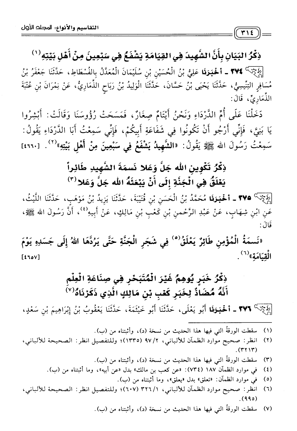 ٣٧٤ - أَخبَرنا عَلِيُّ بْنُ الْحُسَيْنِ بْنِ سُلَيْمَانَ الْمُعَدَّلُ، بِالْفُسْطَاطِ، حَدثنا جَعْفَرُ بْنُ مُسَافِرٍ التِّنِّيسِيُّ، حَدثنا يَحْيَى بْنُ حَسَّانَ، حَدثنا الْوَلِيدُ بْنُ رَبَاحٍ الذِّمَارِيُّ، عَنْ نِمْرَانَ بْنِ عُتْبَةَ الذِّمَارِيِّ، قَالَ: دَخَلْنَا عَلَى أُمِّ الدَّرْدَاءِ وَنَحْنُ أَيْتَامٌ صِغَارٌ، فَمَسَحَتْ رُؤُوسَنَا، وَقَالَتْ: أَبْشِرُوا يَا بَنِيَّ، فَإِنِّي أَرْجُو أَنْ تَكُونُوا فِي شَفَاعَةِ أَبِيكُمْ، فَإِنِّي سَمِعْتُ أَبَا الدَّرْدَاءِ يَقُولُ: سَمِعْتُ رَسُولَ اللهِ صَلى الله عَلَيه وسَلم يَقُولُ: "الشَّهِيدُ يَشْفَعُ فِي سَبْعِينَ مِنْ أَهْلِ بَيْتِهِ". [٤٦٦٠]