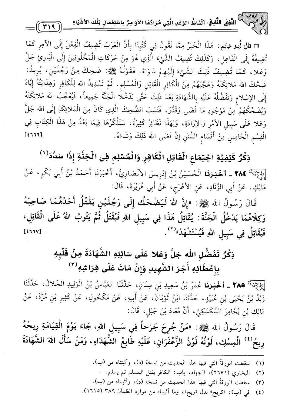 قَالَ أَبُو حَاتِمٍ: هَذَا الْخَبَرُ مِمَّا نَقُولُ فِي كُتِبِنَا بِأَنَّ الْعَرَبَ تُضِيفُ الْفِعْلَ إِلَى الآمِرِ كَمَا تُضِيفُهُ إِلَى الْفَاعِلِ، وَكَذَلِكَ تُضِيفُ الشَّيْءَ الَّذِي هُوَ مِنْ حَرَكَاتِ الْمَخْلُوقِينَ إِلَى الْبَارِئِ جَلَّ وَعَلَا، كَمَا تُضِيفُ ذَلِكَ الشَّيْءَ إِلَيْهِمْ سَوَاءً، فَقَوْلُهُ صَلى الله عَلَيه وسَلم: "ضَحِكَ مِنْ رَجُلَيْنِ" يُرِيدُ ضَحَّكَ اللهُ مَلَائِكَتَهُ وَعَجَّبَهُمْ مِنَ الْكَافِرِ الْقَاتِلِ والْمُسْلِم، ثُمَّ تَسْدِيدُ اللهِ لِلْكَافِرِ وَهِدَايَتُهُ إِيَّاهُ إِلَى الإِسْلَامِ وَتَفَضُّلُهُ عَلَيْهِ بِالشَّهَادَةِ بَعْدَ ذَلِكَ حَتَّى يَدْخُلَا الْجَنَّةَ جَمِيعًا، فَيُعَجِّبُ اللهُ مَلَائِكَتَهُ وَيُضَحِّكُهُمْ مِنْ مَوْجُودِ مَا قَضَى وَقَدَّرَ، فَنُسِبَ الضَّحِكُ الَّذِي كَانَ مِنَ الْمَلَائِكَةِ إِلَى اللهِ جَلَّ وَعَلَا عَلَى سَبِيلِ الأَمْرِ وَالإِرَادَةِ، وَلِهَذَا نَظَائِرُ كَثِيرَةٌ سَنَذْكُرُهَا فِيمَا بَعْدُ مِنْ هَذَا الْكِتَابِ فِي الْقِسْمِ الْخَامِسِ مِنْ أَقْسَامِ السُّنَنِ إِنْ قَضَى اللهُ ذَلِكَ وَشَاءَهُ. [٤٦٦٦]