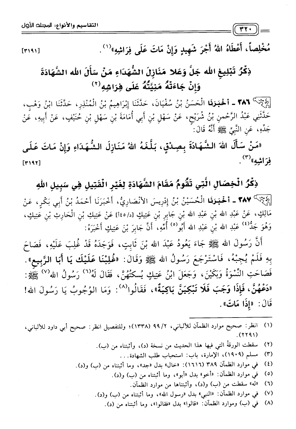 ٣٨٧ - أَخبَرنا الْحُسَيْنُ بْنُ إِدْرِيسَ الأَنْصَارِيُّ، أَخبَرنا أَحْمَدُ بْنُ أَبِي بَكْرٍ، عَنْ مَالِكٍ، عَنْ عَبْدِ اللهِ بْنِ عَبْدِ اللهِ بْنِ جَابِرِ بْنِ عَتِيكٍ، عَنْ عَتِيكِ بْنِ الْحَارِثِ بْنِ عَتِيكٍ، وَهُوَ جَدُّ عَبْدِ اللهِ بْنِ عَبْدِ اللهِ أَبُو أُمِّهِ، أَنَّ جَابِرَ بْنَ عَتِيكٍ أَخْبَرَهُ، أَنَّ رَسُولَ اللهِ صَلى الله عَلَيه وسَلم، جَاءَ يَعُودُ عَبْدَ اللهِ بْنَ ثَابِتٍ فَوَجَدَهُ قَدْ غُلِبَ عَلَيْهِ، فَصَاحَ بِهِ، فَلَمْ يُجِبْهُ، فَاسْتَرْجَعَ رَسُولُ اللهِ صَلى الله عَلَيه وسَلم وَقَالَ: "غُلِبْنَا عَلَيْكَ يَا أَبَا الرَّبِيعِ"، فَصَاحَتِ النِّسْوَةُ وَبَكَيْنَ، وَجَعَلَ ابْنُ عَتِيكٍ يُسَكِّتُهُنَّ، فَقَالَ له رَسُولُ اللهِ صَلى الله عَلَيه وسَلم: "دَعْهُنَّ، فَإِذَا وَجَبَ فَلَا تَبْكِينَّ بَاكِيَةٌ"، فقَالُوا: وَمَا الْوُجُوبُ يَا رَسُولَ اللهِ؟ قَالَ: "إِذَا مَاتَ"، قَالَتِ ابْنَتُهُ: وَاللهِ إِنِّي كُنْتُ لأَرْجُو أَنْ تَكُونَ شَهِيدًا، فَإِنَّكَ كُنْتَ قَدْ قَضَيْتَ جِهَازَكَ، فَقَالَ رَسُولُ اللهِ صَلى الله عَلَيه وسَلم: "إِنَّ اللهَ قَدْ أَوْقَعَ أَجْرَهُ عَلَى قَدْرِ نِيَّتِهِ، وَمَا تَعُدُّونَ الشَّهَادَةَ؟ " قَالُوا: الْقَتْلُ فِي سَبِيلِ اللهِ قَالَ رَسُولُ اللهِ صَلى الله عَلَيه وسَلم: "الشَّهَادَةُ سَبْعٌ سِوَى الْقَتْلِ فِي سَبِيلِ اللهِ: الْمَبْطُونُ شَهِيدٌ، وَالْغَرِيقُ شَهِيدٌ، وَصَاحِبُ ذَاتِ الْجَنْبِ شَهِيدٌ، وَالْمَطْعُونُ شَهِيدٌ، وَصَاحِبُ الْحَرِيقِ شَهِيدٌ، وَالَّذِي يَمُوتُ تَحْتَ الْهَدْمِ شَهِيدٌ، وَالْمَرْأَةُ تَمُوتُ بِجَمْعٍ شَهِيدٌ". [٣١٩٠]
