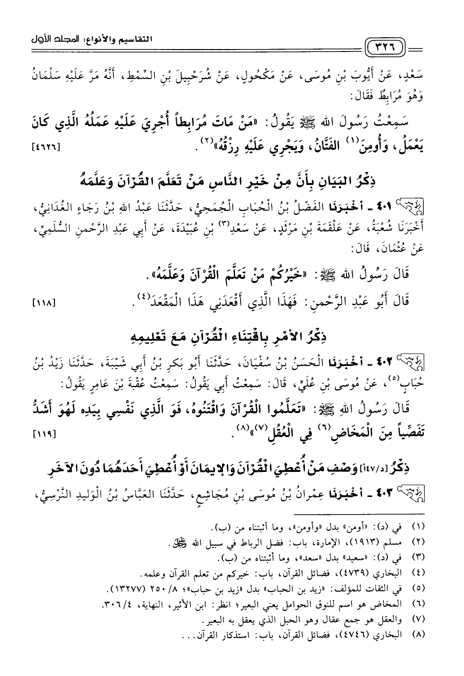 ٤٠١ - أَخبَرنا الْفَضْلُ بْنُ الْحُبَابِ الْجُمَحِيُّ، حَدثنا عَبْدُ اللهِ بْنُ رَجَاءٍ الْغُدَانِيُّ، أَخبَرنا شُعْبَةُ، عَنْ عَلْقَمَةَ بْنِ مَرْثَدٍ، عَنْ سَعدِ بْنِ عُبَيْدَةَ، عَنْ أَبِي عَبْدِ الرَّحْمَنِ السُّلَمِيِّ، عَنْ عُثْمَانَ، قَالَ: قَالَ رَسُولُ اللهِ صَلى الله عَلَيه وسَلم: "خَيْرُكُمْ مَنْ تَعَلَّمَ الْقُرْآنَ وَعَلَّمَهُ".