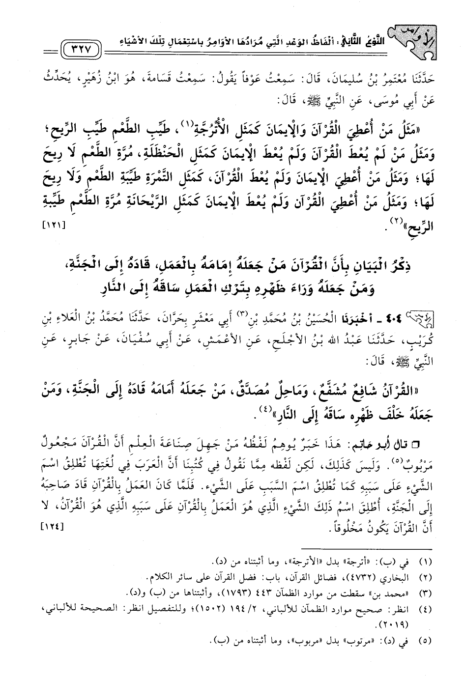 قَالَ أَبُو حَاتِمٍ: هَذَا خَبَرٌ يُوهِمُ لَفْظُهُ مَنْ جَهِلَ صِنَاعَةَ الْعِلْمِ أَنَّ الْقُرْآنَ مَجْعُولٌ مَرْبُوبٌ، وَلَيْسَ كَذَلِكَ، لَكِنَّ لَفْظَهُ مِمَّا نَقُولُ فِي كُتُبِنَا: أنَّ الْعَرَبَ فِي لُغَتِهَا تُطْلِقُ اسْمَ الشَّيْءِ عَلَى سَبَبِهِ، كَمَا تُطْلِقُ اسْمَ السَّبَبِ عَلَى الشَّيْءِ، فَلَمَّا كَانَ الْعَمَلُ بِالْقُرْآنِ قَادَ صَاحِبَهُ إِلَى الْجَنَّةِ أُطْلِقَ اسْمُ ذَلِكَ الشَّيْءِ الَّذِي هُوَ الْعَمَلُ بِالْقُرْآنِ عَلَى سَبَبِهِ الَّذِي هُوَ الْقُرْآنُ، لَا أَنَّ الْقُرْآنَ يَكُونُ مَخْلُوقًا. [١٢٤]
