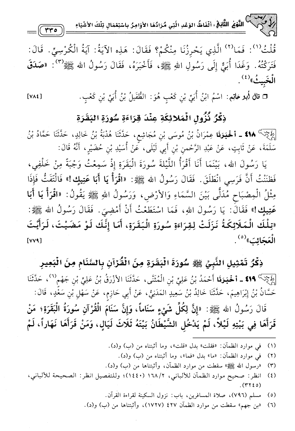 ٤١٨ - أَخبَرنا عِمْرَانُ بْنُ مُوسَى بْنِ مُجَاشِعٍ، حَدثنا هُدْبَةُ بْنُ خَالِدٍ، حَدثنا حَمَّادُ بْنُ سَلَمَةَ، عَنْ ثَابِتٍ، عَنْ عَبْدِ الرَّحْمَنِ بْنِ أَبِي لَيْلَى، عَنْ أُسَيْدِ بْنِ حُضَيْرٍ، أَنَّهُ قَالَ: يَا رَسُولَ اللهِ، بَيْنَمَا أَنَا أَقْرَأُ اللَّيْلَةَ سُورَةَ الْبَقَرَةِ إِذْ سَمِعْتُ وَجْبَةً مِنْ خَلْفِي، فَظَنَنْتُ أَنَّ فَرَسِي انْطَلَقَ، فَقَالَ رَسُولُ اللهِ صَلى الله عَلَيه وسَلم: "اقْرَأْ يَا أَبَا عَتِيكٍ"، فَالْتَفَتُّ فَإِذَا مِثْلُ الْمِصْبَاحِ مُدَلًّى بَيْنَ السَّمَاءِ وَالأَرْضِ، وَرَسُولُ اللهِ صَلى الله عَلَيه وسَلم، يَقُولُ: "اقْرَأْ يَا أَبَا عَتِيكٍ"، فَقَالَ: يَا رَسُولَ اللهِ، فَمَا اسْتَطَعْتُ أَنْ أَمْضِيَ، فَقَالَ رَسُولُ اللهِ صَلى الله عَلَيه وسَلم: "تِلْكَ الْمَلَائِكَةُ نَزَلَتْ لِقِرَاءَةِ سُورَةِ الْبَقَرَةِ، أَمَا إِنَّكَ لَوْ مَضَيْتَ لَرَأَيْتَ الْعَجَائِبَ". [٧٧٩]