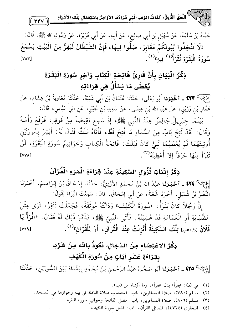 ٤٢٤ - أَخبَرنا عَبْدُ اللهِ بْنُ مُحَمَّدٍ الأَزْدِيُّ، حَدثنا إِسْحَاقُ بْنُ إِبْرَاهِيمَ، أَخبَرنا النَّضْرُ بْنُ شُمَيْلٍ، أَخبَرنا شُعْبَةُ، عَنْ أَبِي إِسْحَاقَ، قَالَ: سَمِعْتُ الْبَرَاءَ، يَقُولُ: إِنَّ رَجُلاً كَانَ يَقْرَأُ سُورَةَ الْكَهْفِ وَدَابَّتُهُ مُوثَقَةٌ، فَجَعَلَتْ تَنْفِرُ، تَرَى مِثْلَ الضَّبَابَةِ أَوِ الْغَمَامَةِ قَدْ غَشِيَتْهُ، فَأَتَى النَّبِيَّ صَلى الله عَلَيه وسَلم، فَذَكَرَ ذَلِكَ لَهُ، فَقَالَ: "اقْرَأْ يَا فُلَانُ، تِلْكَ السَّكِينَةُ أُنْزِلَتْ عِنْدَ الْقُرْآنِ، أَوْ لِلْقُرْآنِ". [٧٦٩]