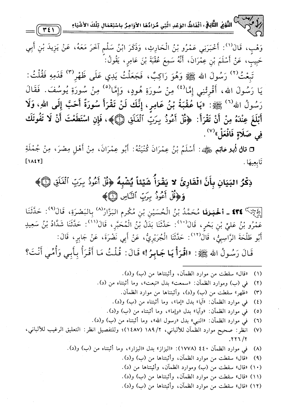 ٤٣٤ - أَخبَرنا مُحَمَّدُ بْنُ الْحُسَيْنِ بْنِ مُكْرَمٍ الْبَزَّارُ بِالْبَصْرَةِ، قَالَ: حَدثنا عَمْرُو بْنُ عَلِيِّ بْنِ بَحْرٍ، قال: حَدثنا بَدَلُ بْنُ الْمُحَبَّرِ، قَالَ: حَدثنا شَدَّادُ بْنُ سَعِيدٍ أَبُو طَلْحَةَ الرَّاسِبِيُّ، قَالَ: حَدثنا الْجُرَيْرِيُّ، عَنْ أَبِي نَضْرَةَ، عَنْ جَابِرٍ، قَالَ: قَالَ رَسُولُ اللهِ صَلى الله عَلَيه وسَلم: "اقْرَأْ يَا جَابِرُ"، قَالَ: قُلْتُ: مَا أَقْرَأُ بِأَبِي وَأُمِّي أَنْتَ؟ قَالَ: "اقرأ: {قُلْ أَعُوذُ بِرَبِّ الْفَلَقِ} وَ {قُلْ أَعُوذُ بِرَبِّ النَّاسِ}، فَقَرَأْتُهُمَا، فَقَالَ النبي صَلى الله عَلَيه وسَلم: "اقْرَأْ بِهِمَا، وَلَنْ تَقْرَأَ بِمِثْلِهِمَا". [٧٩٦]