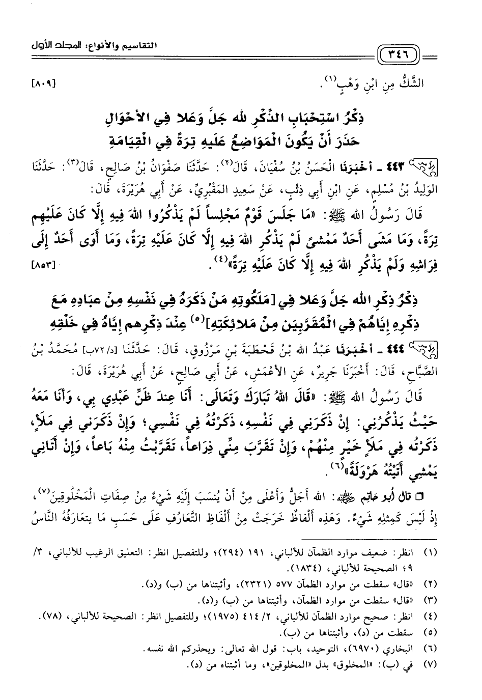 قَالَ أَبُو حَاتِمٍ رَضِيَ اللهُ عَنْهُ: اللهُ أَجَلُّ وَأَعْلَى مِنْ أَنْ يُنْسَبَ إِلَيْهِ شَيْءٌ مِنْ صِفَاتِ الْمَخْلُوقِين، إِذْ لَيْسَ كَمِثْلِهِ شَيْءٌ، وَهَذِهِ أَلْفَاظٌ خَرَجَتْ مِنْ أَلْفَاظِ التَّعَارُفِ عَلَى حَسَبِ مَا يَتَعَارَفُهُ النَّاسُ فيمَا بَيْنَهُمْ، وَمَنْ ذَكَرَ رَبَّهُ جَلَّ وَعَلَا فِي نَفْسِهِ بِنُطْقٍ، أَوْ عَمَلٍ يَتَقَرَّبُ بِهِ إِلَى رَبِّهِ، ذَكَرَهُ اللهُ فِي مَلَكُوتِهِ بِالْمَغْفِرَةِ لَهُ تَفَضُّلاً وَجُودًا، وَمَنْ ذَكَرَ رَبَّهُ فِي مَلأٍ مِنْ عِبَادِهِ، ذَكَرَهُ اللهُ فِي مَلَائِكَتِهِ الْمُقَرَّبِينَ بِالْمَغْفِرَةِ لَهُ، وَقَبُولِ مَا أَتَى عَبْدُهُ مِنْ ذِكْرِهِ، وَمَنْ تَقَرَّبَ إِلَى الْبَارِي جَلَّ وَعَلَا بِقَدْرِ شِبْرٍ مِنَ الطَّاعَاتِ، كَانَ وُجُودُ الرَّأْفَةِ وَالرَّحْمَةِ مِنَ الرَّبِّ مِنْهُ لَهُ أَقْرَبَ بِذِرَاعٍ، وَمَنْ تَقَرَّبَ إِلَى مَوْلَاهُ جَلَّ وَعَلَا بِقَدْرِ ذِرَاعٍ مِنَ الطَّاعَاتِ كَانَتِ الْمَغْفِرَةُ مِنْهُ لَهُ أَقْرَبَ بِبَاعٍ، وَمَنْ أَتَى فِي أَنْوَاعِ الطَّاعَاتِ بِالسُّرْعَةِ كَالْمَشْيِ، أَتَتْهُ أَنْوَاعُ الْوَسَائِلِ وَوُجُودُ الرَّأْفَةِ وَالرَّحْمَةِ وَالْمَغْفِرَةِ بِالسُّرْعَةِ كَالْهَرْوَلَةِ، وَاللهُ أَعْلَى وَأَجَلُّ. [٨١١]