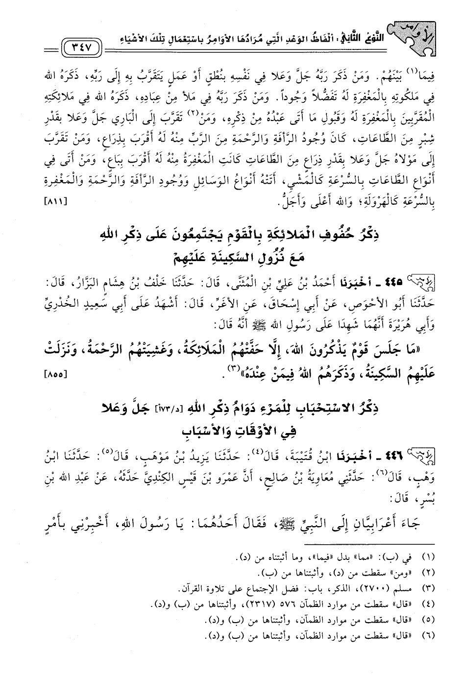 ذِكْرُ حُفُوفِ الْمَلَائِكَةِ بِالْقَوْمِ يَجْتَمِعُونَ عَلَى ذِكْرِ اللهِ مَعَ نُزُولِ السَّكِينَةِ عَلَيْهِمْ.