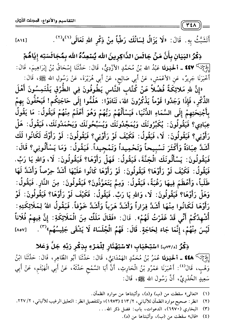 ٤٤٨ - أَخبَرنا عُمَرُ بْنُ مُحَمَّدٍ الْهَمْدَانِيُّ، قَالَ: حَدثنا أَبُو الطَّاهِرِ، قَالَ: حَدثنا ابْنُ وَهْبٍ، قال: أَخبَرنا عَمْرُو بْنُ الْحَارِثِ، أَنَّ أَبَا السَّمْحِ حَدَّثَهُ، عَنْ أَبِي الْهَيْثَمِ، عَنْ أَبِي سَعِيدٍ الْخُدْرِيِّ، أَنَّ رَسُولَ اللهِ صَلى الله عَلَيه وسَلم، قَالَ: "أَكْثِرُوا ذِكْرَ اللهِ حَتَّى يَقُولُوا: مَجْنُونٌ". [٨١٧]