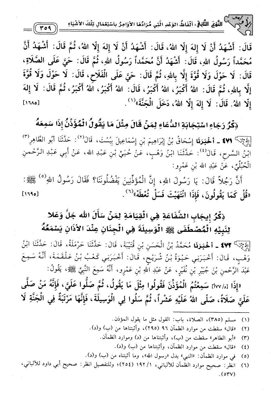 ٤٧١ - أَخبَرنا إِسْحَاقُ بْنُ إِبْرَاهِيمَ بْنِ إِسْمَاعِيلَ بِبُسْتَ، قَالَ: حَدثنا أَبُو الطَّاهِرِ بْنِ السَّرْحِ، قَالَ: حَدثنا ابْنُ وَهْبٍ، عَنْ حُيَيِّ بْنِ عَبْدِ اللهِ، عَنْ أَبِي عَبْدِ الرَّحْمَنِ الْحُبُلِيِّ، عَنْ عَبْدِ اللهِ بْنِ عَمْرٍو، أَنَّ رَجُلاً قَالَ: يَا رَسُولَ اللهِ، إِنَّ الْمُؤَذِّنِينَ يَفْضُلُونَنَا، فَقَالَ رَسُولُ اللهِ صَلى الله عَلَيه وسَلم: "قُلْ كَمَا يَقُولُونَ فَإِذَا انْتَهَيْتَ فَسَلْ تُعْطَهْ". [١٦٩٥]
