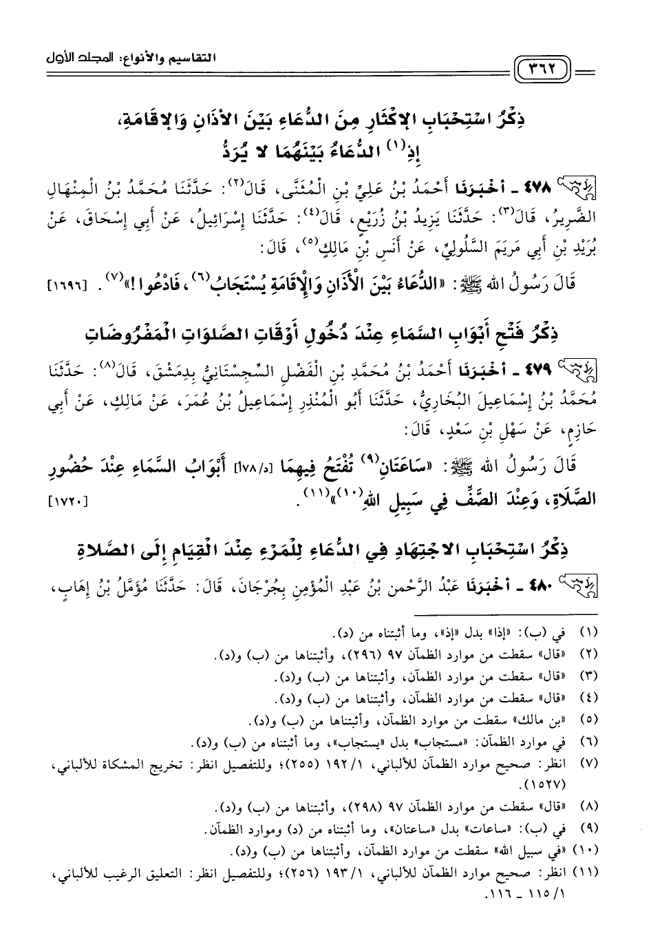 ٤٧٨ - أَخبَرنا أَحْمَدُ بْنُ عَلِيِّ بْنِ الْمُثَنَّى، قَالَ: حَدثنا مُحَمَّدُ بْنُ الْمِنْهَالِ الضَّرِيرُ، قَالَ: حَدثنا يَزِيدُ بْنُ زُرَيْعٍ، قَالَ: حَدثنا إِسْرَائِيلُ، عَنْ أَبِي إِسْحَاقَ، عَنْ بُرَيْدِ بْنِ أَبِي مَرْيَمَ السَّلُولِيِّ، عَنْ أَنَسِ بْنِ مَالِكٍ، قَالَ: قَالَ رَسُولُ اللهِ صَلى الله عَلَيه وسَلم: "الدُّعَاءُ بَيْنَ الأَذَانِ وَالإِقَامَةِ يُسْتَجَابُ، فَادْعُوا". [١٦٩٦]