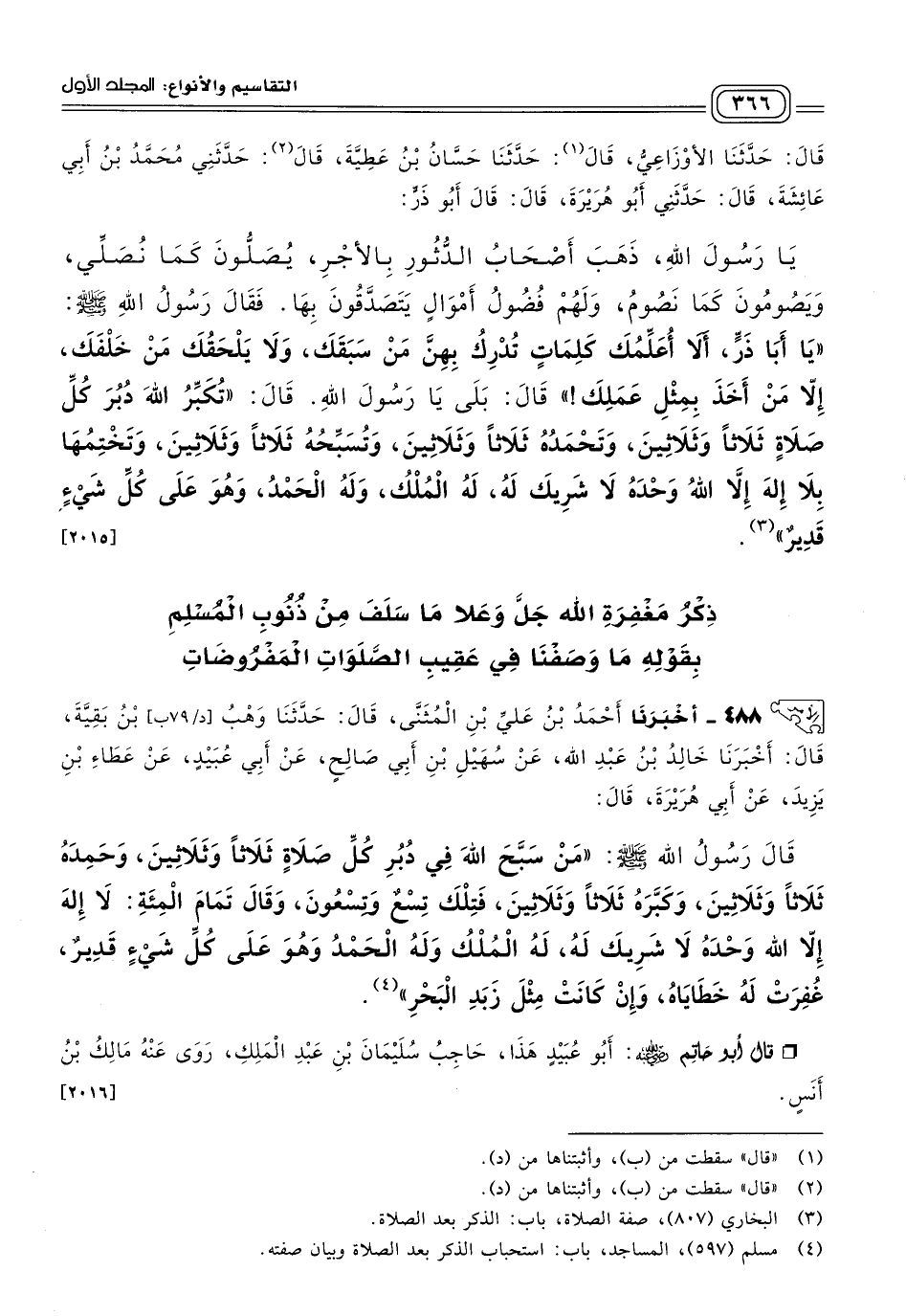 ٤٨٨ - أَخبَرنا أَحْمَدُ بْنُ عَلِيِّ بْنِ الْمُثَنَّى، قَالَ: حَدثنا وَهْبُ بْنُ بَقِيَّةَ، قَالَ: أَخبَرنا خَالِدُ بْنُ عَبْدِ اللهِ، عَنْ سُهَيْلِ بْنِ أَبِي صَالِحٍ، عَنْ أَبِي عُبَيْدٍ، عَنْ عَطَاءِ بْنِ يَزِيدَ، عَنْ أَبِي هُرَيْرَةَ، قَالَ: قَالَ رَسُولُ اللهِ صَلى الله عَلَيه وسَلم: "مَنْ سَبَّحَ اللهَ فِي دُبُرِ كُلِّ صَلَاةٍ ثَلَاثًا وَثَلَاثِينَ، وَحَمَدَهُ ثَلَاثًا وَثَلَاثِينَ، وَكَبَّرَهُ ثَلَاثًا وَثَلَاثِينَ، فَتِلْكَ تِسْعٌ وَتِسْعُونَ، وَقَالَ تَمَامَ الْمِئَةِ: لَا إِلَهَ إِلَاّ اللهُ وَحْدَهُ لَا شَرِيكَ لَهُ، لَهُ الْمُلْكُ، وَلَهُ الْحَمْدُ، وَهُوَ عَلَى كُلِّ شَيْءٍ قَدِيرٌ، غُفِرَتْ لَهُ خَطَايَاهُ وَإِنْ كَانَتْ مِثْلَ زَبَدِ الْبَحْرِ".