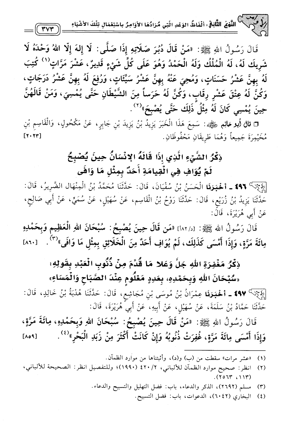٤٩٧ - أَخبَرنا عِمْرَانُ بْنُ مُوسَى بْنِ مُجَاشِعٍ، قَالَ: حَدثنا هُدْبَةُ بْنُ خَالِدٍ، قَالَ: حَدثنا حَمَّادُ بْنُ سَلَمَةَ، عَنْ سُهَيْلٍ، عَنْ أَبِيهِ، عَنْ أَبِي هُرَيْرَةَ، قَالَ: قَالَ رَسُولُ اللهِ صَلى الله عَلَيه وسَلم: "مَنْ قَالَ حِينَ يُصْبِحُ: سُبْحَانَ اللهِ وَبِحَمْدِهِ، مِائَةَ مَرَّةٍ، وَإِذَا أَمْسَى مِائَةَ مَرَّةٍ، غُفِرَتْ ذُنُوبُهُ وَإِنْ كَانَتْ أَكْثَرَ مِنْ زَبَدِ الْبَحْرِ". [٨٥٩]