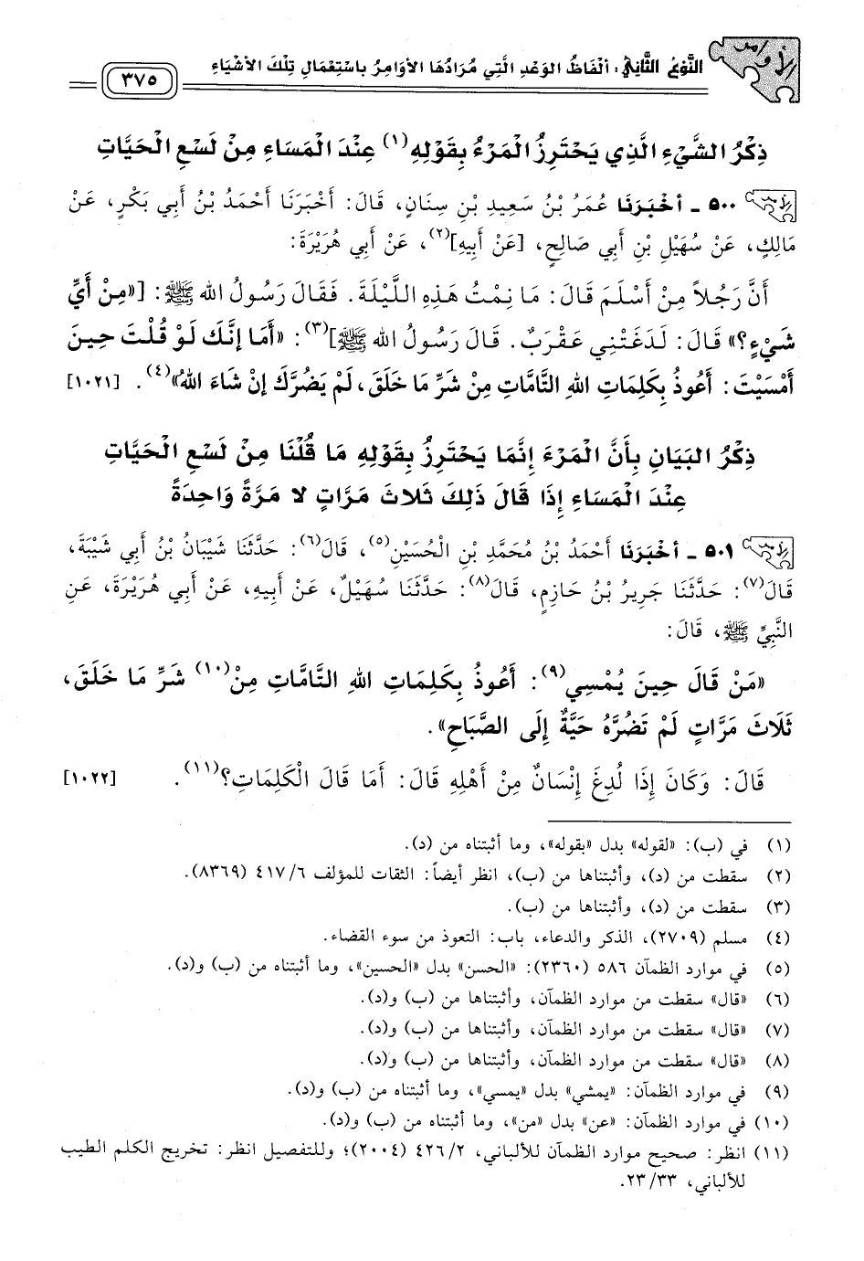 ٥٠١ - أَخبَرنا أَحْمَدُ بْنُ مُحَمَّدِ بْنِ الْحُسَيْنِ، قَالَ: حَدثنا شَيْبَانُ بْنُ أَبِي شَيْبَةَ، قَالَ: حَدثنا جَرِيرُ بْنُ حَازِمٍ، قَالَ: حَدثنا سُهَيْلٌ، عَنْ أَبِيهِ، عَنْ أَبِي هُرَيْرَةَ، عَنِ النَّبِيِّ صَلى الله عَلَيه وسَلم، قَالَ: "مَنْ قَالَ حِينَ يُمْسِي: أَعُوذُ بِكَلِمَاتِ اللهِ التَّامَّاتِ مِنْ شَرِّ مَا خَلَقَ، ثَلَاثَ مَرَّاتٍ، لَمْ تَضُرَّهُ حَيَّةٌ إِلَى الصَّبَاحِ".