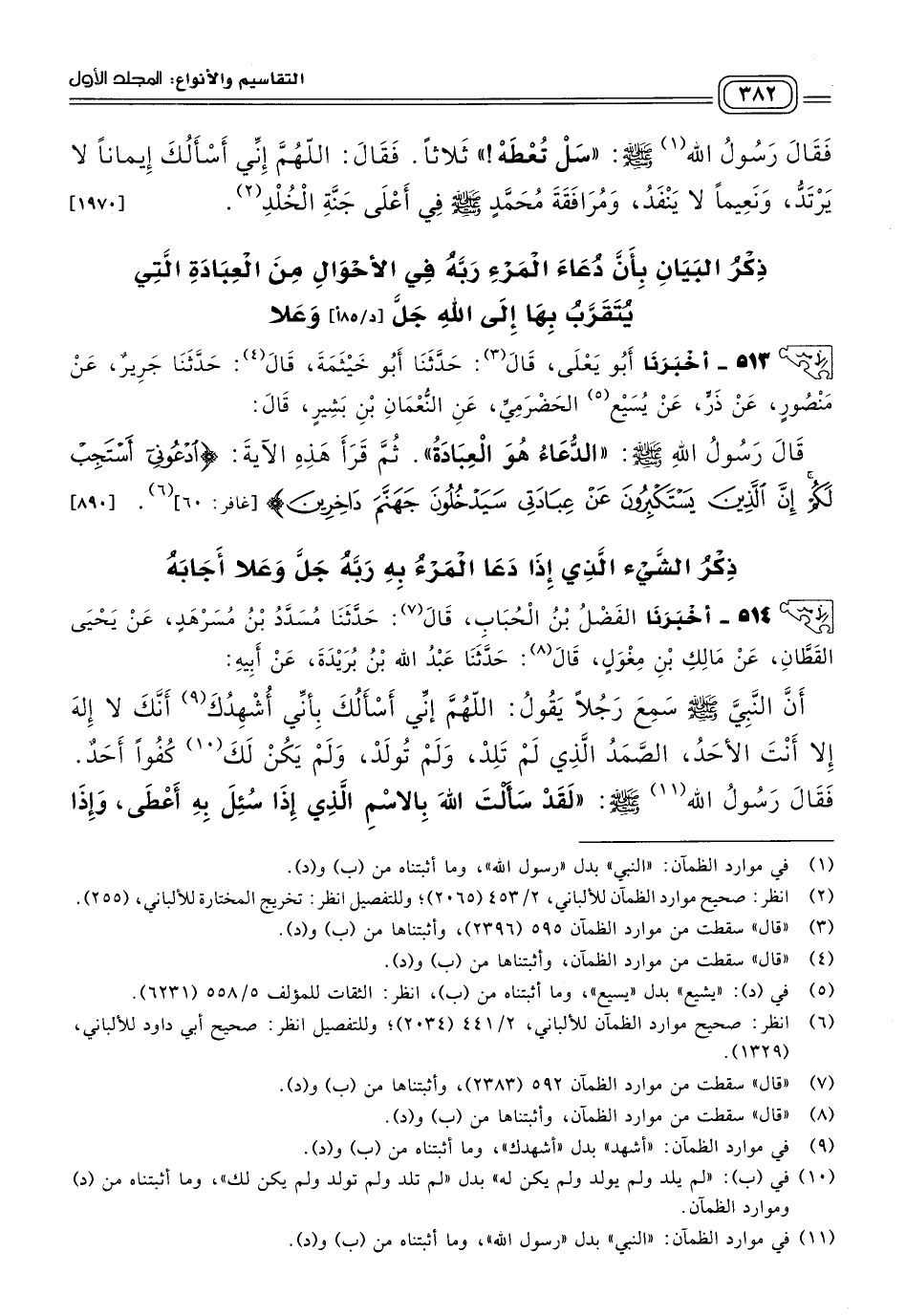 ٥١٤ - أَخبَرنا الْفَضْلُ بْنُ الْحُبَابِ، قَالَ: حَدثنا مُسَدَّدُ بْنُ مُسَرْهَدٍ، عَنْ يَحْيَى الْقَطَّانِ، عَنْ مَالِكِ بْنِ مِغْوَلٍ، قَالَ: حَدثنا عَبْدُ اللهِ بْنُ بُرَيْدَةَ، عَنْ أَبِيهِ، أَنَّ النَّبِيَّ صَلى الله عَلَيه وسَلم سَمِعَ رَجُلاً يَقُولُ: اللهُمَّ إِنِّي أَسْأَلُكَ بِأَنِّي أُشْهِدُكَ أَنَّكَ لَا إِلَهَ إِلَاّ أَنْتَ، الأَحَدُ الصَّمَدُ، الَّذِي لَمْ تَلِدْ وَلَمْ تُولَدْ، وَلَمْ يَكُنْ لَكَ كُفُوًا أَحَدٌ، فَقَالَ رَسُولُ اللهِ صَلى الله عَلَيه وسَلم: "لَقَدْ سَأَلْتَ اللهَ بِالاِسْمِ الَّذِي إِذَا سُئِلَ بِهِ أَعْطَى، وَإِذَا دُعِيَ بِهِ أَجَابَ". [٨٩١]