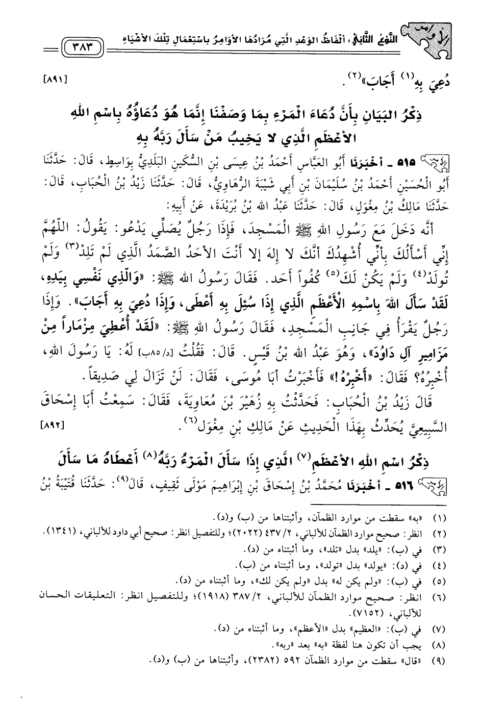 ذِكْرُ الْبَيَانِ بِأَنَّ دُعَاءَ الْمَرْءِ بِمَا وَصَفْنَا إِنَّمَا هُوَ دُعَاؤُهُ بِاسْمِ اللهِ الأَعْظَمِ الَّذِي لَا يَخِيبُ مَنْ سَأَلَ رَبَّهُ بِهِ.