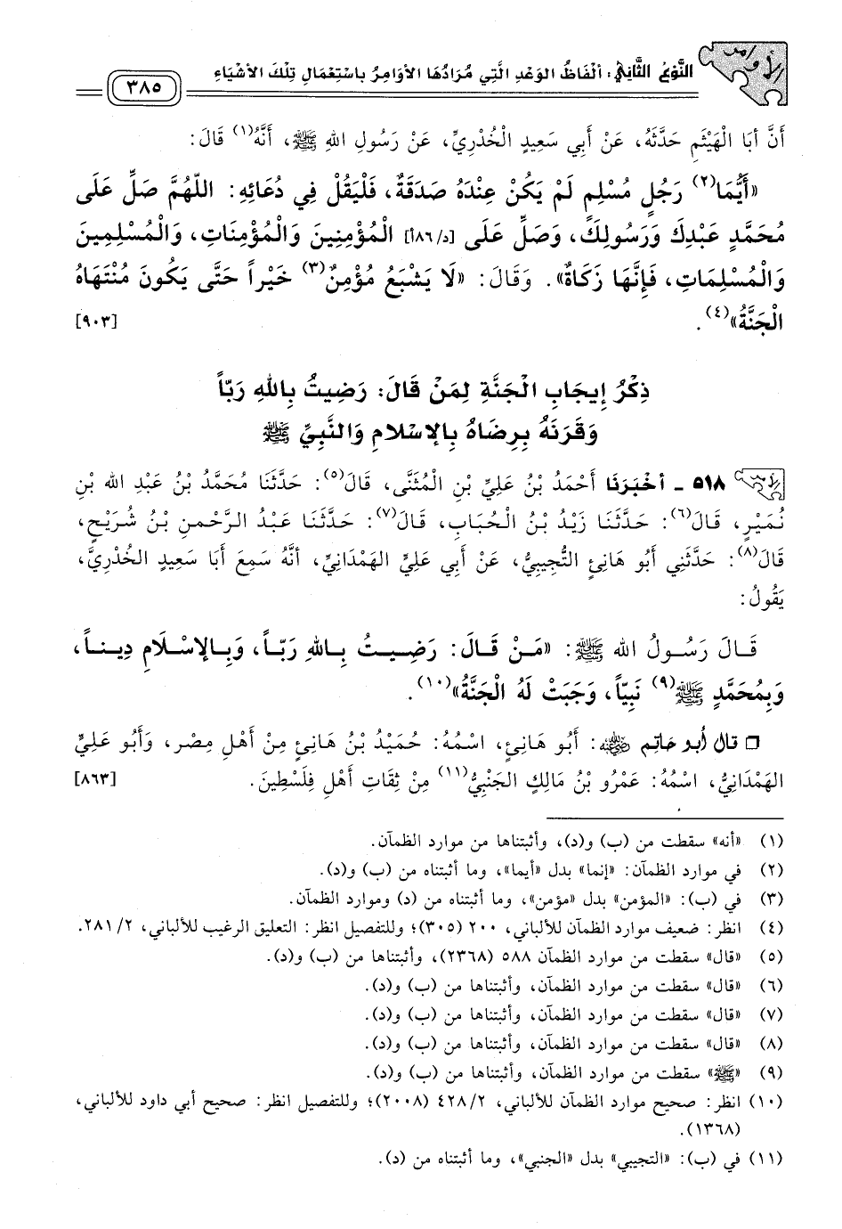 ٥١٨ - أَخبَرنا أَحْمَدُ بْنُ عَلِيِّ بْنِ الْمُثَنَّى، قَالَ: حَدثنا مُحَمَّدُ بْنُ عَبْدِ اللهِ بْنِ نُمَيْرٍ، قَالَ: حَدثنا زَيْدُ بْنُ الْحُبَابِ، قَالَ: حَدثنا عَبْدُ الرَّحْمَنِ بْنُ شُرَيْحٍ، قَالَ: حَدَّثَنِي أَبُو هَانِئٍ التُّجِيبِيُّ، عَنْ أَبِي عَلِيٍّ الْهَمْدَانِيِّ، أَنَّهُ سَمِعَ أَبَا سَعِيدٍ الْخُدْرِيَّ، يَقُولُ: قَالَ رَسُولُ اللهِ صَلى الله عَلَيه وسَلم: "مَنْ قَالَ: رَضِيتُ بِاللهِ رَبًّا، وَبِالإِسْلَامِ دِينًا، وَبِمُحَمَّدٍ صَلى الله عَلَيه وسَلم نَبِيًّا، وَجَبَتْ لَهُ الْجَنَّةُ".