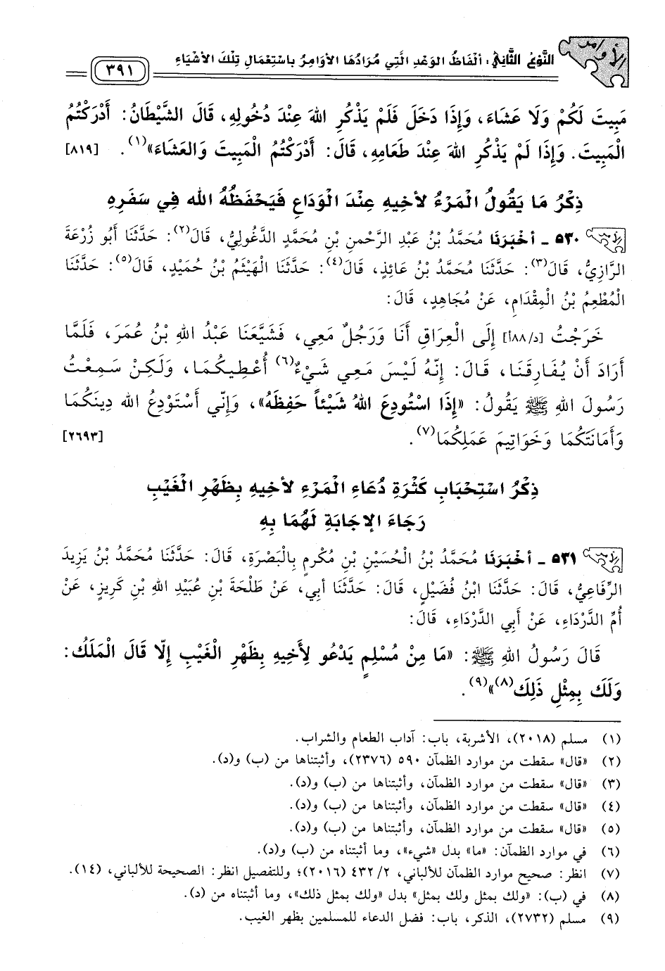 ٥٣٠ - أَخبَرنا مُحَمَّدُ بْنُ عَبْدِ الرَّحْمَنِ بْنِ مُحَمَّدٍ الدَّغَوْلِيُّ، قَالَ: حَدثنا أَبُو زُرْعَةَ الرَّازِيُّ، قَالَ: حَدثنا مُحَمَّدُ بْنُ عَائِذٍ، قَالَ: حَدثنا الْهَيْثَمُ بْنُ حُمَيْدٍ، قَالَ: حَدثنا الْمُطْعِمُ بْنُ الْمِقْدَامِ، عَنْ مُجَاهِدٍ، قَالَ: خَرَجْتُ إِلَى الْعِرَاقِ أَنَا وَرَجُلٌ مَعِي، فَشَيَّعَنَا عَبْدُ اللهِ بْنُ عُمَرَ، فَلَمَّا أَرَادَ أَنْ يُفَارِقَنَا، قَالَ: إِنَّهُ لَيْسَ مَعِي شَيْءٌ أُعْطِيكُمَا، وَلَكِنْ سَمِعْتُ رَسُولَ اللهِ صَلى الله عَلَيه وسَلم يَقُولُ: "إِذَا اسْتُوْدِعَ اللهُ شَيْئًا حَفِظَهُ"، وَإِنِّي أَسْتَوْدِعُ اللهَ دِينَكُمَا وَأَمَانَتَكُمَا، وَخَوَاتِيمَ عَمَلِكُمَا. [٢٦٩٣]