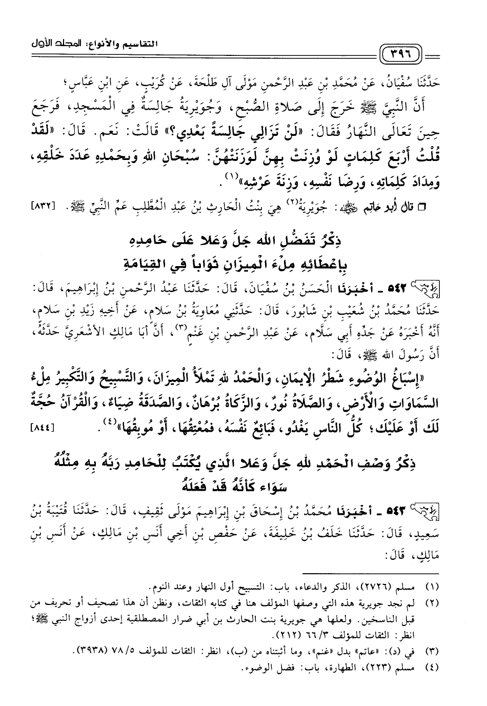 ٥٤٢ - أَخبَرنا الْحَسَنُ بْنُ سُفْيَانَ، قَالَ: حَدثنا عَبْدُ الرَّحْمَنِ بْنُ إِبْرَاهِيمَ، قَالَ: حَدثنا مُحَمَّدُ بْنُ شُعَيْبِ بْنِ شَابُورَ، قَالَ: حَدَّثَنِي مُعَاوِيَةُ بْنُ سَلَاّمٍ، عَنْ أَخِيهِ زَيْدِ بْنِ سَلَاّمٍ أَنَّهُ أَخْبَرَهُ، عَنْ جَدِّهِ أَبِي سَلَاّمٍ، عَنْ عَبْدِ الرَّحْمَنِ بْنِ غَنْمٍ، أَنَّ أَبَا مَالِكٍ الأَشْعَرِيَّ حَدَّثَهُ، أَنَّ رَسُولَ اللهِ صَلى الله عَلَيه وسَلم، قَالَ: "إِسْبَاغُ الْوُضُوءِ شَطْرُ الإِيمَانِ، وَالْحَمْدُ للهِ تَمْلأُ الْمِيزَانَ، وَالتَّسْبِيحُ وَالتَّكْبِيرُ مِلْءُ السَّمَاوَاتِ وَالأَرْضِ، وَالصَّلَاةُ نُورٌ، وَالزَّكَاةُ بُرْهَانٌ، وَالصَّدَقَةُ ضِيَاءٌ، وَالْقُرْآنُ حُجَّةٌ لَكَ، أَوْ عَلَيْكَ، كُلُّ النَّاسِ يَغْدُو، فَبَائِعٌ نَفْسَهُ فَمُعْتِقُهَا، أَوْ مُوبِقُهَا". [٨٤٤]