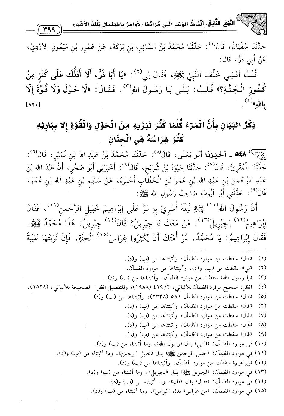 ٥٤٨ - أَخبَرنا أَبُو يَعْلَى، قَالَ: حَدثنا مُحَمَّدُ بْنُ عَبْدِ اللهِ بْنِ نُمَيْرٍ، قَالَ: حَدثنا الْمُقْرِئُ، قَالَ: حَدثنا حَيْوَةُ بْنُ شُرَيْحٍ، قَالَ: أَخْبَرَنِي أَبُو صَخْرٍ، أَنَّ عَبْدَ اللهِ بْنَ عَبْدِ الرَّحْمَنِ بْنِ عَبْدِ اللهِ بْنِ عُمَرَ بْنِ الْخَطَّابِ أَخْبَرَهُ، عَنْ سَالِمِ بْنِ عَبْدِ اللهِ بْنِ عُمَرَ، قَالَ: حَدَّثَنِي أَبُو أَيُّوبَ صَاحِبُ رَسُولِ اللهِ صَلى الله عَلَيه وسَلم، أَنَّ رَسُولَ اللهِ صَلى الله عَلَيه وسَلم لَيْلَةَ أُسْرِيَ بِهِ مَرَّ عَلَى إِبْرَاهِيمَ خَلِيلِ الرَّحْمَنِ، فَقَالَ إِبْرَاهِيمُ لِجِبْرِيلَ: مَنْ مَعَكَ يَا جِبْرِيلُ؟ قَالَ جِبْرِيلُ: هَذَا مُحَمَّدٌ صَلى الله عَلَيه وسَلم، فَقَالَ إِبْرَاهِيمُ: يَا مُحَمَّدُ مُرْ أُمَّتَكَ أَنْ يُكْثِرُوا غِرَاسَ الْجَنَّةِ، فَإِنَّ تُرْبَتَهَا طَيِّبَةٌ، وَأَرْضَهَا وَاسِعَةٌ، فَقَالَ رَسُولُ اللهِ صَلى الله عَلَيه وسَلم لإِبْرَاهِيمَ: "وَمَا غِرَاسُ الْجَنَّةِ؟ " قَالَ: لَا حَوْلَ وَلَا قُوَّةَ إِلَاّ بِاللهِ. [٨٢١]