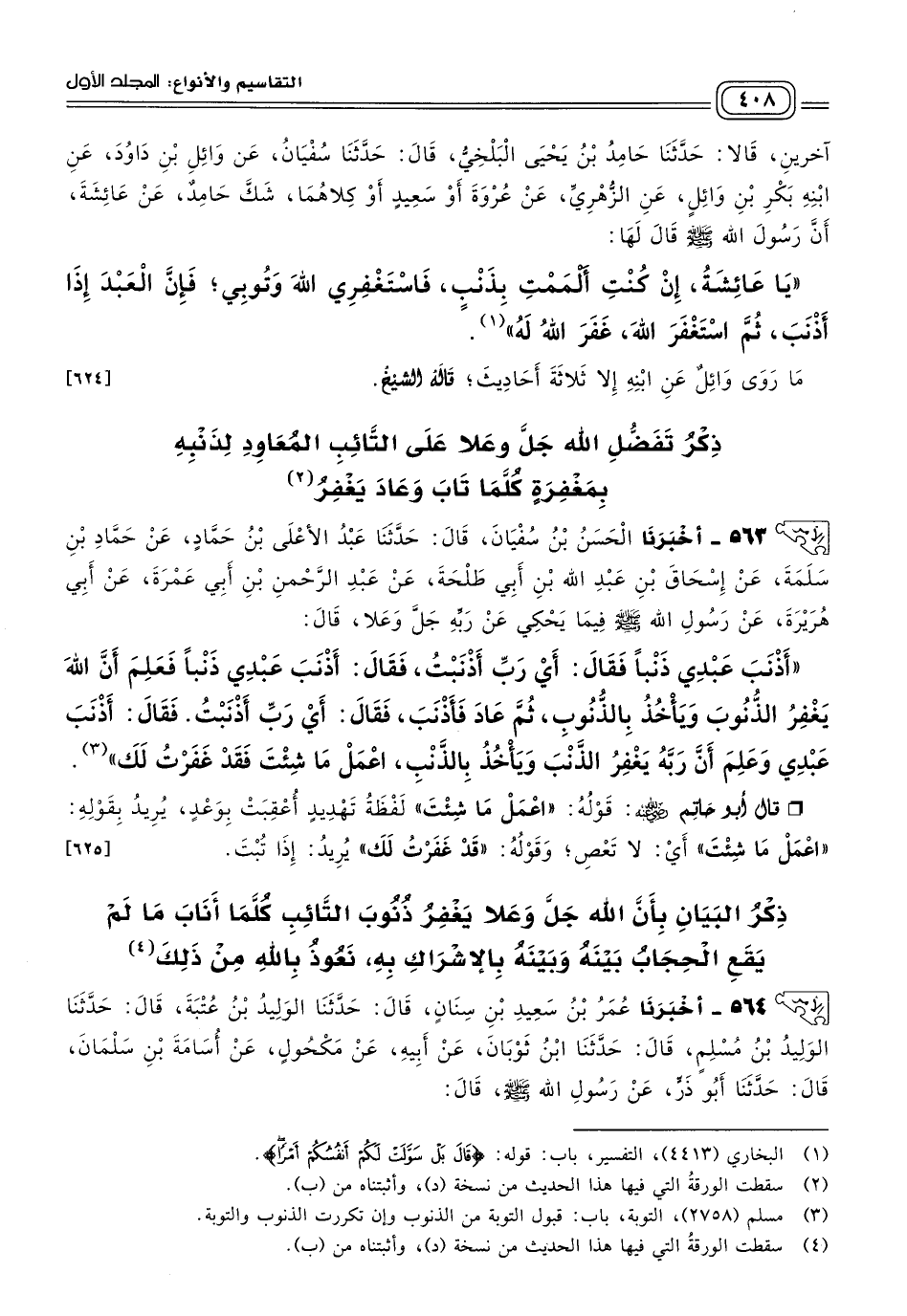 ذِكْرُ الْبَيَانِ بِأَنَّ اللهَ جَلَّ وَعَلَا يَغْفِرُ ذُنُوبَ التَّائِبِ، كُلَّمَا أَنَابَ مَا لَمْ يَقَعِ الْحِجَابُ بَيْنَهُ وَبَيْنَهُ بِالإِشْرَاكِ بِهِ نَعُوذُ بِاللهِ مِنْ ذَلِكَ.