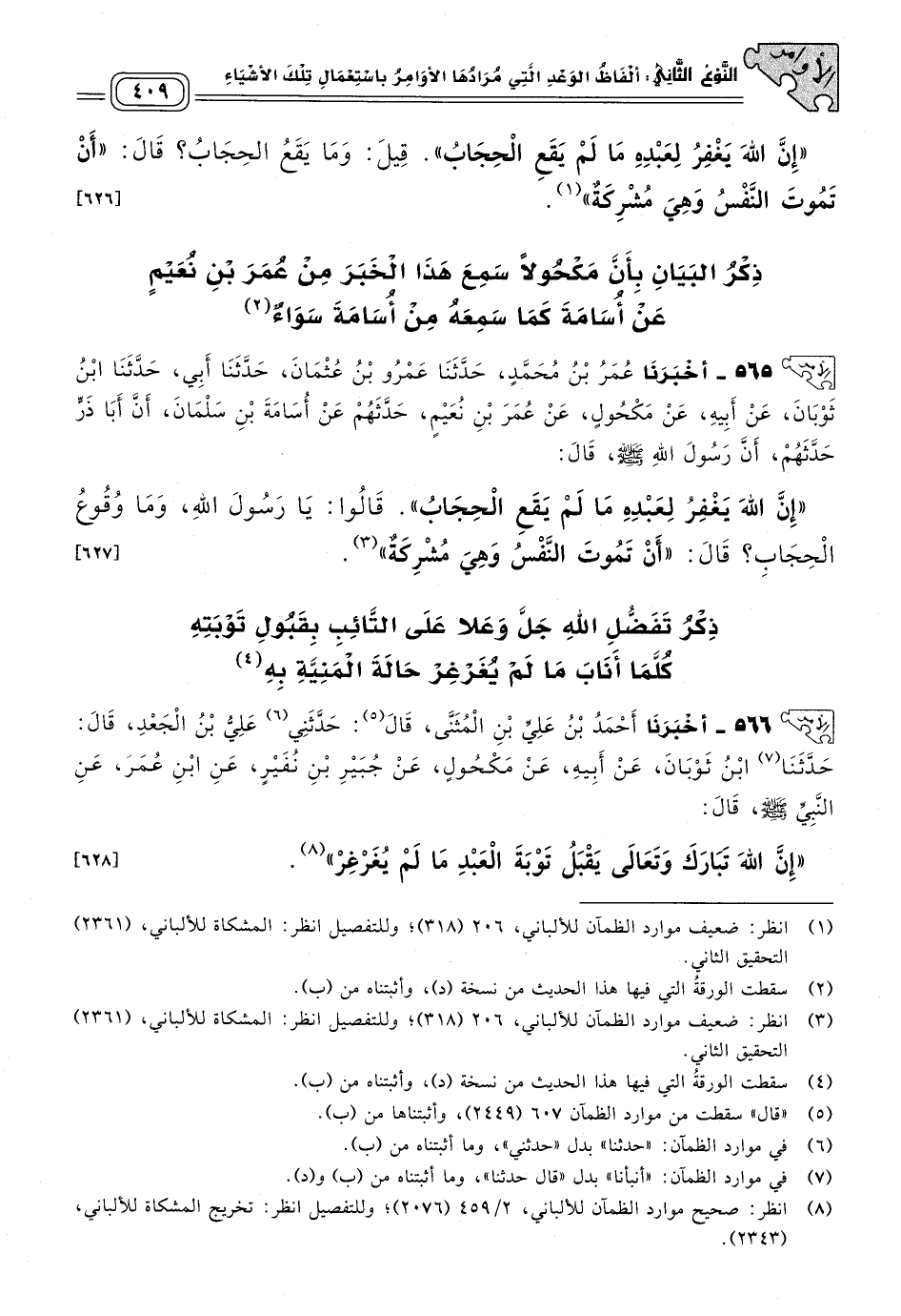 ٥٦٥ - أَخبَرنا عُمَرُ بْنُ مُحَمَّدٍ، حَدثنا عَمْرُو بْنُ عُثْمَانَ، حَدثنا أَبِي، حَدثنا ابْنُ ثَوْبَانَ، عَنْ أَبِيهِ، عَنْ مَكْحُولٍ، عَنْ عُمَرَ بْنِ نُعَيْمٍ، حَدَّثَهُمْ عَنْ أُسَامَةَ بْنِ سَلْمَانَ، أَنَّ أَبَا ذَرٍّ، حَدَّثَهُمْ أَنَّ رَسُولَ اللهِ صَلى الله عَلَيه وسَلم، قَالَ: "إِنَّ اللهَ يَغْفِرُ لِعَبْدِهِ مَا لَمْ يَقَعِ الْحِجَابُ"، قَالُوا: يَا رَسُولَ اللهِ، وَمَا وُقُوعُ الْحِجَابِ؟ قَالَ: "أَنْ تَمُوتَ النَّفْسُ وَهِيَ مُشْرِكَةٌ". [٦٢٧]