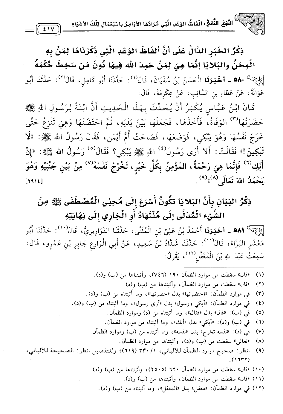 ٥٨٠ - أَخبَرنا الْحَسَنُ بْنُ سُفْيَانَ، قَالَ: حَدثنا أَبُو كَامِلٍ، قَالَ: حَدثنا أَبُو عَوَانَةَ، عَنْ عَطَاءِ بْنِ السَّائِبِ، عَنْ عِكْرِمَةَ، قَالَ: كَانَ ابْنُ عَبَّاسٍ، يُكْثِرُ أَنْ يُحَدِّثَ بِهَذَا الْحَدِيثِ، أَنَّ ابْنَةً لِرَسُولِ اللهِ صَلى الله عَلَيه وسَلم، حَضَرَتْهَا الْوَفَاةُ، فَأَخَذَهَا فَجَعَلَهَا بَيْنَ يَدَيْهِ، ثُمَّ احْتَضَنَهَا وَهِيَ تَنْزِعُ حَتَّى خَرَجَ نَفَسُهَا وَهُوَ يَبْكِي، فَوَضَعَهَا فَصَاحَتْ أُمُّ أَيْمَنَ، فَقَالَ رَسُولُ اللهِ صَلى الله عَلَيه وسَلم: "لَا تَبْكِين"، فَقَالَتْ: أَلَا أَرَى رَسُولَ اللهِ صَلى الله عَلَيه وسَلم، يَبْكِي؟ فقَالَ رَسُولُ اللهِ صَلى الله عَلَيه وسَلم: إِنْ أَبْكِ فَإِنَّمَا هِيَ رَحْمَةٌ، الْمُؤْمِنُ بِكُلِّ خَيْرٍ تَخْرُجُ نَفْسُهُ مِنْ بَيْنَ جَنْبَيْهِ وَهُوَ يَحْمَدُ اللهَ تعالى". [٢٩١٤]