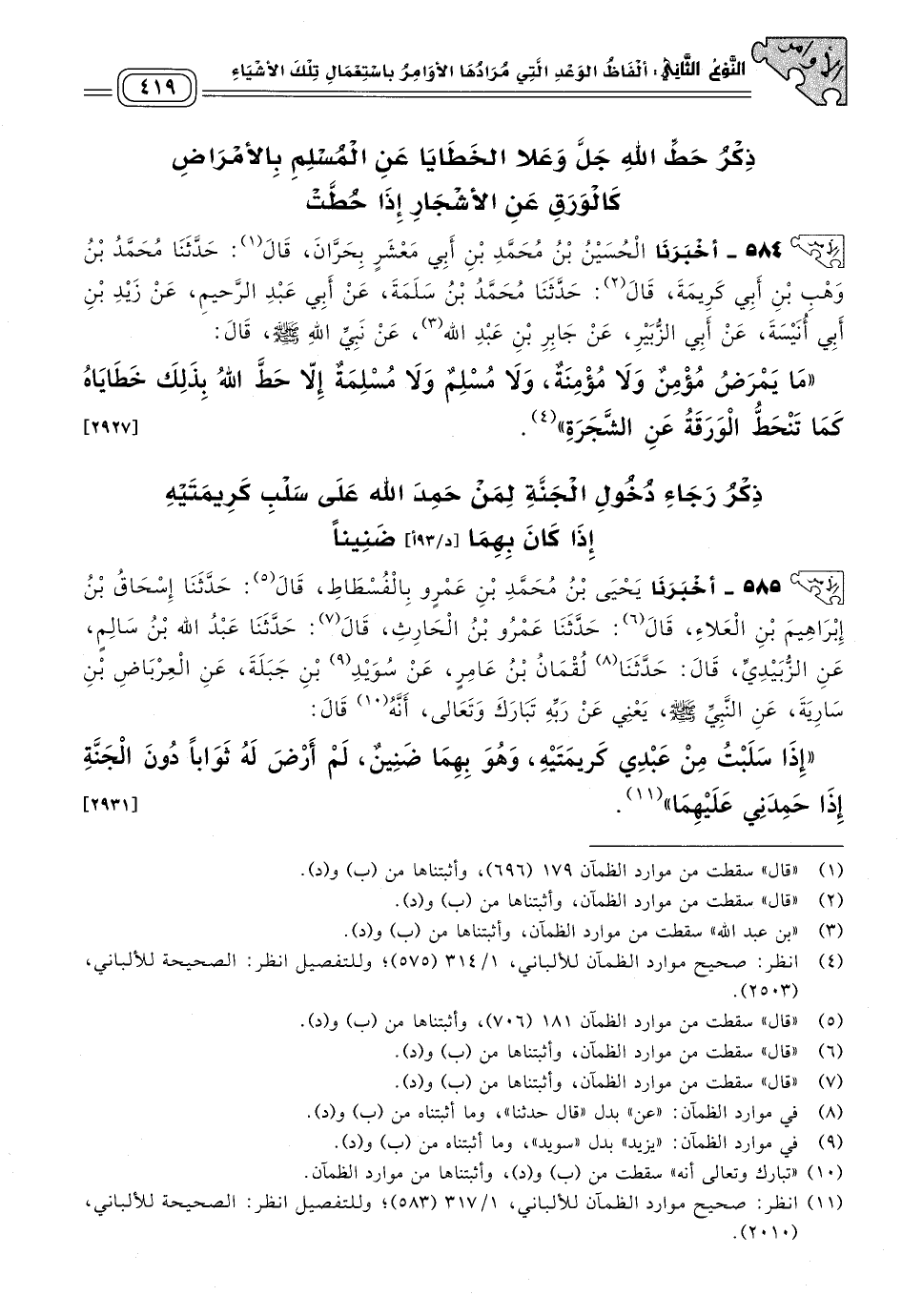 ٥٨٥ - أَخبَرنا يَحْيَى بْنُ مُحَمَّدِ بْنِ عَمْرٍو، بِالْفُسْطَاطِ، قَالَ: حَدثنا إِسْحَاقُ بْنُ إِبْرَاهِيمَ بْنِ الْعَلَاءِ، قَالَ: حَدثنا عَمْرُو بْنُ الْحَارِثِ، قَالَ: حَدثنا عَبْدُ اللهِ بْنُ سَالِمٍ، عَنِ الزُّبَيْدِيِّ، قَالَ: حَدثنا لُقْمَانُ بْنُ عَامِرٍ، عَنْ سُوَيْدِ بْنِ جَبَلَةَ، عَنِ الْعِرْبَاضِ بْنِ سَارِيَةَ، عَنِ النَّبِيِّ صَلى الله عَلَيه وسَلم، يَعْنِي عَنْ رَبِّهِ تبارك وتعالى أنه قَالَ: "إِذَا سَلَبْتُ مِنْ عَبْدِي كَرِيمَتَيْهِ وَهُوَ بِهِمَا ضَنِينٌ، لَمْ أَرْضَ لَهُ ثَوَابًا دُونَ الْجَنَّةِ إِذَا حَمِدَنِي عَلَيْهِمَا". [٢٩٣١]