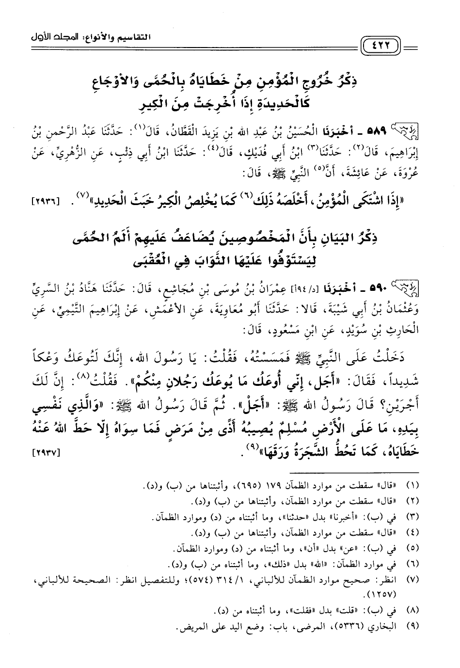 ٥٩٠ - أَخبَرنا عِمْرَانُ بْنُ مُوسَى بْنِ مُجَاشِعٍ، قَالَ: حَدثنا هَنَّادُ بْنُ السَّرِيِّ، وَعُثْمَانُ بْنُ أَبِي شَيْبَةَ، قَالَا: حَدثنا أَبُو مُعَاوِيَةَ، عَنِ الأَعْمَشِ، عَنِ ابْرَاهِيمَ التَّيْمِيِّ، عَنِ الْحَارِثِ بْنِ سُوَيْدٍ، عَنِ ابْنِ مَسْعُودٍ، قَالَ: دَخَلْتُ عَلَى النَّبِيِّ صَلى الله عَلَيه وسَلم، فَمَسَسْتُهُ، فَقُلْتُ: يَا رَسُولَ اللهِ، إِنَّكَ لَتُوعَكُ وَعْكًا شَدِيدًا، فَقَالَ: "أَجَلْ إِنِّي أُوعَكُ مَا يُوعَكُ رَجُلَانِ مِنْكُمْ"، فقُلْتُ: إِنَّ لَكَ أَجْرَيْنِ؟ قَالَ رَسُولُ اللهِ صَلى الله عَلَيه وسَلم: "أَجَلْ"، ثُمَّ قَالَ رَسُولُ اللهِ صَلى الله عَلَيه وسَلم: "وَالَّذِي نَفْسِي بِيَدِهِ، مَا عَلَى الأَرْضِ مُسْلِمٌ يُصِيبُهُ أَذًى مِنْ مَرَضٍ فَمَا سِوَاهُ، إِلَاّ حَطَّ اللهُ عَنْهُ خَطَايَاهُ كَمَا تَحُطُّ الشَّجَرَةُ وَرَقَهَا". [٢٩٣٧]
