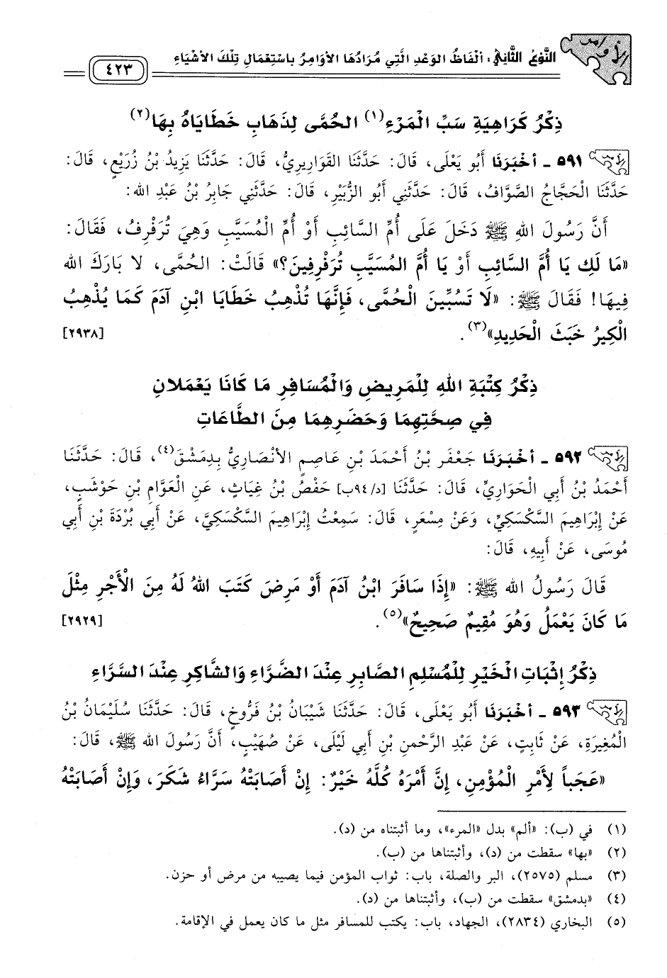 ذِكْرُ إِثْبَاتِ الْخَيْرِ لِلْمُسْلِمِ الصَّابِرِ عِنْدِ الضَّرَاءِ، وَالشَّاكِرِ عِنْدَ السَّرَّاءِ.
