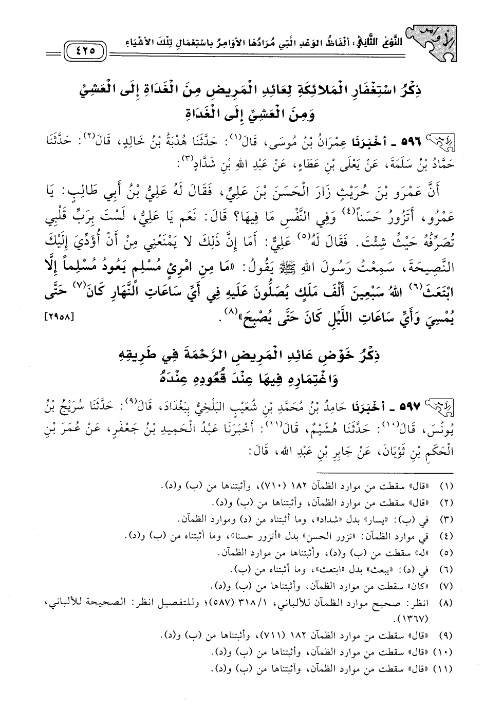 ٥٩٦ - أَخبَرنا عِمْرَانُ بْنُ مُوسَى، قَالَ: حَدثنا هُدْبَةُ بْنُ خَالِدٍ، قَالَ: حَدثنا حَمَّادُ بْنُ سَلَمَةَ، عَنْ يَعْلَى بْنِ عَطَاءٍ، عَنْ عَبْدِ اللهِ بْنِ شداد، أَنَّ عَمْرَو بْنَ حُرَيْثٍ زَارَ الْحَسَنَ بْنَ عَلِيٍّ، فَقَالَ لَهُ عَلِيُّ بْنُ أَبِي طَالِبٍ: يَا عَمْرُو أَتَزُورُ حَسَنًا وَفِي النَّفْسِ مَا فِيهَا؟ قَالَ: نَعَمْ، يَا عَلِيُّ لَسْتَ بِرَبِّ قَلْبِي تُصَرِّفُهُ حَيْثُ شِئْتَ، فَقَالَ له عَلِيٌّ: أَمَا إِنَّ ذَلِكَ لَا يَمْنَعُنِي مِنْ أَنْ أُؤَدِّيَ إِلَيْكَ النَّصِيحَةَ، سَمِعْتُ رَسُولَ اللهِ صَلى الله عَلَيه وسَلم يَقُولُ: "مَا مِنِ امْرِئٍ مُسْلِمٍ يَعُودُ مُسْلِمًا إِلَاّ ابْتَعَثَ اللهُ سَبْعِينَ أَلْفَ مَلَكٍ يُصَلُّونَ عَلَيْهِ فِي أَيِّ سَاعَاتِ النَّهَارِ كَانَ حَتَّى يُمْسِيَ وَأَيِّ سَاعَاتِ اللَّيْلِ كَانَ حَتَّى يُصْبِحَ". [٢٩٥٨]