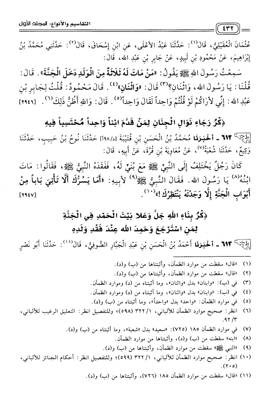 ٦١٣ - أَخبَرنا أَحْمَدُ بْنُ الْحَسَنِ بْنِ عَبْدِ الْجَبَّارِ الصُّوفِيُّ، قَالَ: حَدثنا أَبُو نَصْرٍ التَّمَّارُ، قَالَ: حَدثنا حَمَّادُ بْنُ سَلَمَةَ، عَنْ أَبِي سِنَانٍ، قَالَ: دَفَنْتُ ابْنِي سنانا وَمَعِي أَبُو طَلْحَةَ الْخَوْلَانِيُّ عَلَى شَفِيرِ الْقَبْرِ، فَلَمَّا أَرَدْتُ الْخُرُوجَ أَخَذَ بِيَدِي فَأَخْرَجَنِي، وَقَالَ: أَلَا أُبَشِّرُكَ؟ حَدَّثَنِي الضَّحَّاكُ بْنُ عَبْدِ الرَّحْمَنِ بْنِ عَرْزَبٍ، عَنْ أَبِي مُوسَى الأَشْعَرِيِّ، قَالَ: قَالَ رَسُولُ اللهِ صَلى الله عَلَيه وسَلم: "إِذَا مَاتَ وَلَدُ الْعَبْدِ الْمُؤْمِنِ قَالَ اللهُ لِمَلائِكَتِه: قَبَضْتُمْ وَلَدَ عَبْدِي؟ قَالُوا: نَعَمْ. قَالَ: قَبَضْتُمْ ثَمَرَةَ فُؤَادِهِ؟ قَالُوا: نَعَمْ. قَالَ: فَمَا قَالَ؟ قَالُوا: اسْتَرْجَعَ وَحَمِدَكَ. قَالَ: ابْنُوا لَهُ بَيْتًا فِي الْجَنَّةِ، وَسَمُّوهُ بَيْتَ الْحَمْدِ".