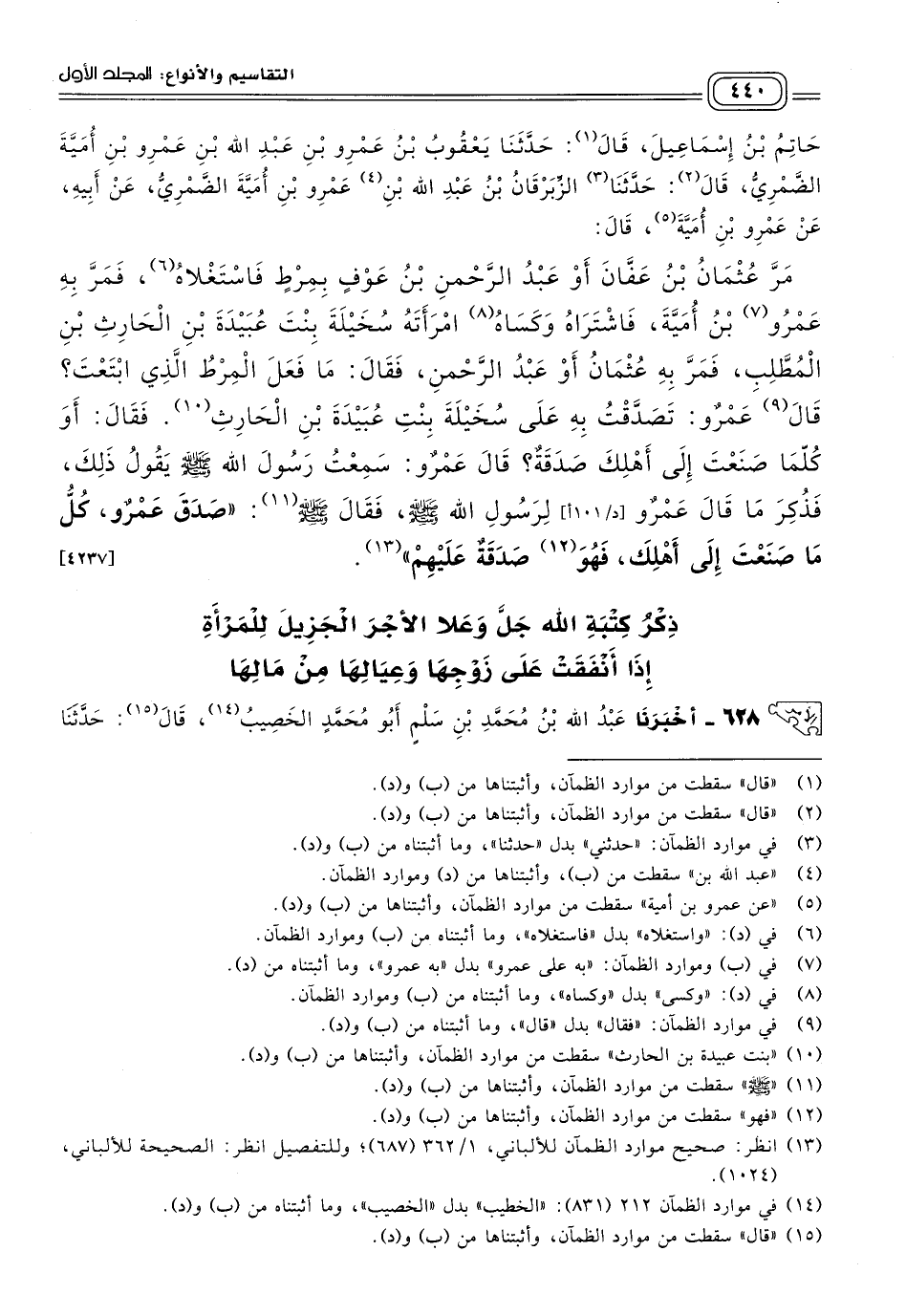 ٦٢٨ - أَخبَرنا عَبْدُ اللهِ بْنُ مُحَمَّدِ بْنِ سَلْمٍ أَبُو مُحَمَّدٍ الْخَصِيبُ، قَالَ: حَدثنا حَرْمَلَةُ بْنُ يَحْيَى، قَالَ: حَدثنا ابْنُ وَهْبٍ، قَالَ: أَخْبَرَنِي عَمْرُو بْنُ الْحَارِثِ، أَنَّ هِشَامَ بْنَ عُرْوَةَ حَدَّثَهُ، عَنْ أَبِيهِ، عَنْ عُبَيْدِ اللهِ بْنِ عَبْدِ اللهِ بْنِ عُتْبَةَ، عَنْ رَيْطَةَ امْرَأَةِ عَبْدِ اللهِ بْنِ مَسْعُودٍ أُمِّ وَلَدِهِ، وَكَانَتِ امْرَأَةً صَنَاعة، وَلَيْسَ لِعَبْدِ اللهِ بْنِ مَسْعُودٍ مَالٌ، قال: وَكَانَتْ تُنْفِقُ عَلَيْهِ وَعَلَى وَلَدِهِ مِنْ ثَمَرَةِ ضَيْعَتِهَا، فَقَالَتْ له يوما: وَاللهِ لَقَدْ شَغَلْتَنِي أَنْتَ وَوَلَدُكَ عَنِ الصَّدَقَةِ، فَمَا أَسْتَطِيعُ أَنْ أَتَصَدَّقَ مَعَكُمْ، فَقَالَ: مَا أُحِبُّ إِنْ لَمْ يَكُنْ لَكِ فِي ذَلِكَ أَجْرٌ أَنْ تَفْعَلِي، فَسَأَلَ رَسُولَ اللهِ صَلى الله عَلَيه وسَلم هُوَ أو هِيَ، فَقَالَتْ: يَا رَسُولَ اللهِ، إِنِّي امْرَأَةٌ وَلِيَ ضَيْعَةٌ فَأَبِيعُ مِنْهَا، وَلَيْسَ لِي، وَلَا لِزَوْجِي، وَلَا لِوَلَدِي شَيْءٌ، وَشَغَلُونِي فَلَا أَتَصَدَّقُ، فَهَلْ لِي فِي النَّفَقَةِ عَلَيْهِمْ مِنْ أَجْرٍ؟ فَقَالَ: "لَكِ فِي ذَلِكَ أَجْرُ مَا أَنْفَقْتِ عَلَيْهِمْ، فَأَنْفِقِي عَلَيْهِمْ". [٤٢٤٧]