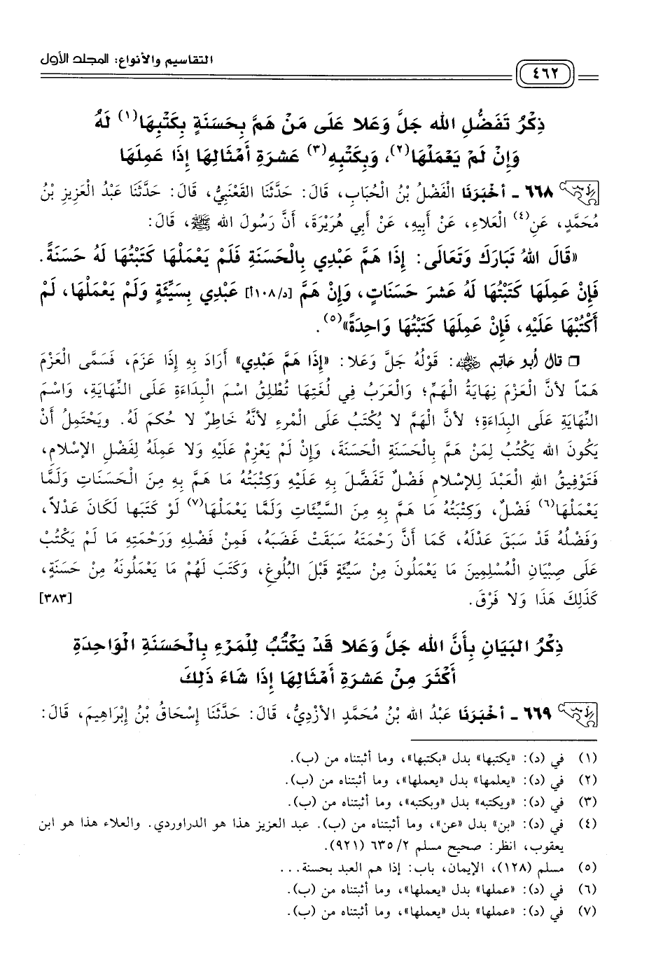 ٦٦٨ - أَخبَرنا الْفَضْلُ بْنُ الْحُبَابِ، قَالَ: حَدثنا الْقَعْنَبِيُّ، قَالَ: حَدثنا عَبْدُ الْعَزِيزِ بْنُ مُحَمَّدٍ، عَنِ الْعَلَاءِ، عَنْ أَبِيهِ، عَنْ أَبِي هُرَيْرَةَ: أنَّ رَسُولَ اللهِ صَلى الله عَلَيه وسَلم، قَالَ: قَالَ اللهُ تَبَارَكَ وَتَعَالَى: "إِذَا هَمَّ عَبْدِي بِالْحَسَنَةِ فَلَمْ يَعْمَلْهَا، كَتَبْتُهَا لَهُ حَسَنَةً، فَإِنْ عَمِلَهَا، كَتَبْتُهَا لَهُ عَشْرَ حَسَنَاتٍ، وَإِنْ هَمَّ عَبْدِي بِسَيِّئَةٍ وَلَمْ يَعْمَلْهَا، لَمْ أَكْتُبْهَا عَلَيْهِ، فَإِنْ عَمِلَهَا، كَتَبْتُهَا وَاحِدَةً".
