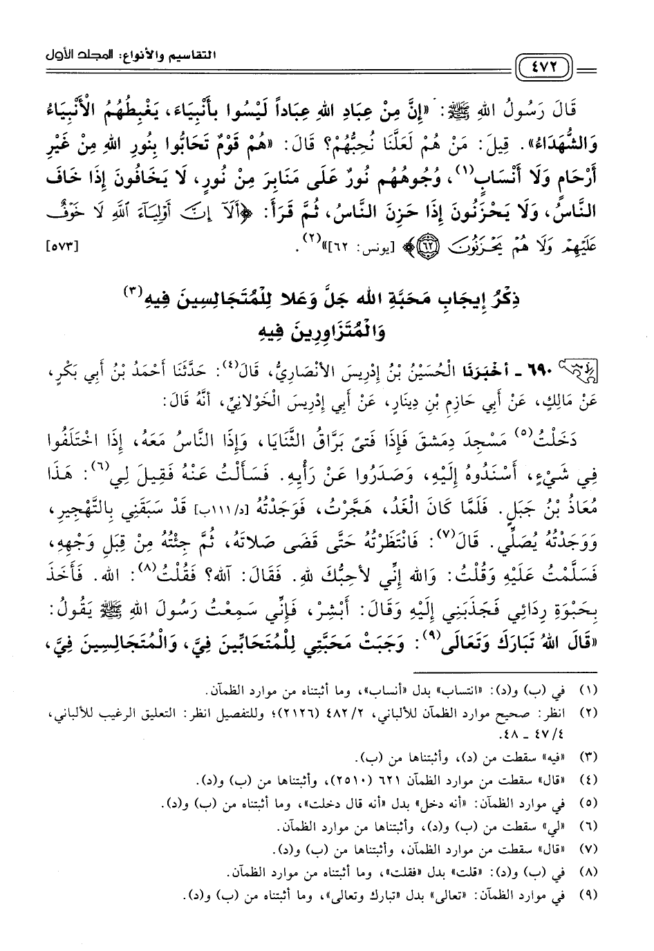 ٦٩٠ - أَخبَرنا الْحُسَيْنُ بْنُ إِدْرِيسَ الأَنْصَارِيُّ، قَالَ: حَدثنا أَحْمَدُ بْنُ أَبِي بَكْرٍ، عَنْ مَالِكٍ، عَنْ أَبِي حَازِمِ بْنِ دِينَارٍ، عَنْ أَبِي إِدْرِيسَ الْخَوْلَانِيِّ، أَنَّهُ قَالَ: دَخَلْتُ مَسْجِدَ دِمَشْقَ فَإِذَا فَتًى بَرَّاقُ الثَّنَايَا، وَإِذَا النَّاسُ مَعَهُ، إِذَا اخْتَلَفُوا فِي شَيْءٍ، أَسْنَدُوهُ إِلَيْهِ، وَصَدَرُوا عَنْ رَأْيِهِ، فَسَأَلْتُ عَنْهُ، فَقِيلَ لي: هَذَا مُعَاذُ بْنُ جَبَلٍ، فَلَمَّا كَانَ الْغَدُ، هَجَّرْتُ فَوَجَدْتُهُ قَدْ سَبَقَنِي بِالتَّهْجِيرِ، وَوَجَدْتُهُ يُصَلِّي، قَالَ: فَانْتَظَرْتُهُ حَتَّى قَضَى صَلَاتَهُ، ثُمَّ جِئْتُهُ مِنْ قِبَلِ وَجْهِهِ، فَسَلَّمْتُ عَلَيْهِ وَقُلْتُ: وَاللهِ إِنِّي لأُحِبُّكَ للهِ، فقَالَ: آلله؟ قُلْتُ: آلله، فَأَخَذَ بِحَبْوَةِ رِدَائِي فَجَذَبَنِي إِلَيْهِ، وَقَالَ: أَبْشِرْ، فَإِنِّي سَمِعْتُ رَسُولَ اللهِ صَلى الله عَلَيه وسَلم يَقُولَ: قَالَ اللهُ تَبَارَكَ وَتَعَالَى: "وَجَبَتْ مَحَبَّتِي لِلْمُتَحَابِّينَ فِيَّ، وَالْمُتَجَالِسِينَ فِيَّ، وَالْمُتَزَاوِرِينَ فِيَّ".