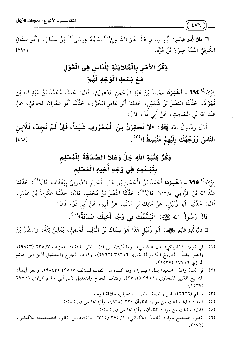 قَالَ أَبُو حَاتِمٍ رَضِيَ اللهُ عَنْهُ: أَبُو زُمَيْلٍ هَذَا: هُوَ سِمَاكُ بْنُ الْوَلِيدِ الْحَنَفِيُّ يَمَانِيٌّ ثِقَةٌ، وَالنَّضْرُ بْنُ مُحَمَّدٍ هَذَا: هُوَ الْجُرَشِيُّ الْيَمَامِيُّ، وَالنَّضْرُ بْنُ مُحَمَّدٍ مَرْوَزِيٌّ، صَاحِبُ الرَّأْيِ، وَكَانَا فِي زَمَنٍ وَاحِدٍ. [٤٧٤]