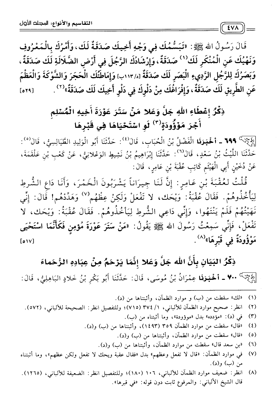 ٦٩٩ - أَخبَرنا الْفَضْلُ بْنُ الْحُبَابِ، قَالَ: حَدثنا أَبُو الْوَلِيدِ الطَّيَالِسِيُّ، قَالَ: حَدثنا اللَّيْثُ بْنُ سَعْدٍ، قَالَ: حَدثنا إِبْرَاهِيمُ بْنُ نَشِيطٍ الْوَعْلَانِيُّ، عَنْ كَعْبِ بْنِ عَلْقَمَةَ، عَنْ دُخَيْنٍ أَبِي الْهَيْثَمِ، كَاتِبِ عُقْبَةَ بْنِ عَامِرٍ، قَالَ: قُلْتُ لِعُقْبَةَ بْنِ عَامِرٍ: إِنَّ لَنَا جِيرَانًا يَشْرَبُونَ الْخَمْرَ، وَأَنَا دَاعٍ الشُّرْطَ لِيَأْخُذُوهُمْ، فقَالَ عُقْبَةُ: وَيْحَكَ، لَا تَفْعَلْ، وَلَكِنْ عِظْهُمْ وَهَدِّدْهُمْ، قَالَ: إِنِّي نَهَيْتُهُمْ، فَلَمْ يَنْتَهُوا، وَإِنِّي دَاعي الشُّرْطَ لِيَأْخُذُوهُمْ، فقَالَ عُقْبَةُ: وَيْحَكَ، لَا تَفْعَلْ، فَإِنِّي سَمِعْتُ رَسُولَ اللهِ صَلى الله عَلَيه وسَلم، يَقُولُ: "مَنْ سَتَرَ عَوْرَةَ مُؤْمِنٍ، فَكَأَنَّمَا اسْتَحْيَى مَوْؤُودَةً فِي قَبْرِهَا". [٥١٧]