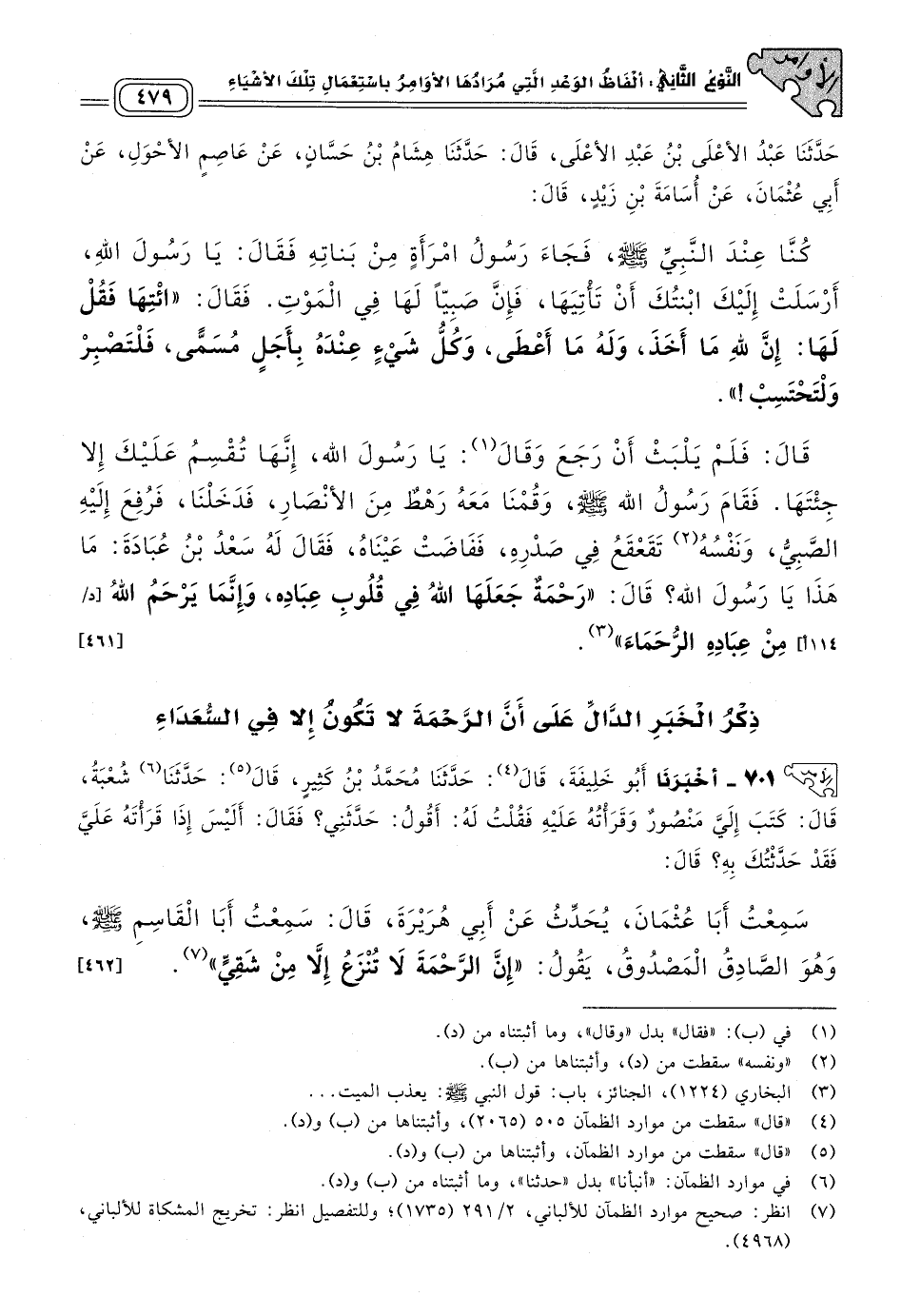 ٧٠١ - أَخبَرنا أَبُو خَلِيفَةَ، قَالَ: حَدثنا مُحَمَّدُ بْنُ كَثِيرٍ، قَالَ: حَدثنا شُعْبَةُ، قَالَ: كَتَبَ إِلَيَّ مَنْصُورٌ، وَقَرَأْتُهُ عَلَيْهِ، فَقُلْتُ لَهُ: أَقُولُ: حَدَّثَنِي؟ فقَالَ: أَلَيْسَ إِذَا قَرَأْتَهُ عَلَيَّ فَقَدْ حَدَّثْتُكَ بِهِ؟ قَالَ: سَمِعْتُ أَبَا عُثْمَانَ يُحَدِّثُ عَنْ أَبِي هُرَيْرَةَ، قَالَ: سَمِعْتُ أَبَا الْقَاسِمِ صَلى الله عَلَيه وسَلم وَهُوَ الصَّادِقُ الْمَصْدُوقُ، يَقُولُ: "إِنَّ الرَّحْمَةَ لَا تُنْزَعُ إِلَاّ مِنْ شَقِيٍّ". [٤٦٢]