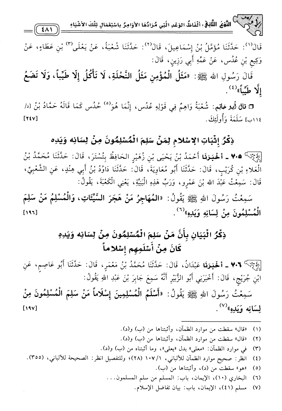 ذِكْرُ إِثْبَاتِ الإِسْلَامِ لِمَنْ سَلِمَ الْمُسْلِمُونَ مِنْ لِسَانِهِ وَيَدِهِ.