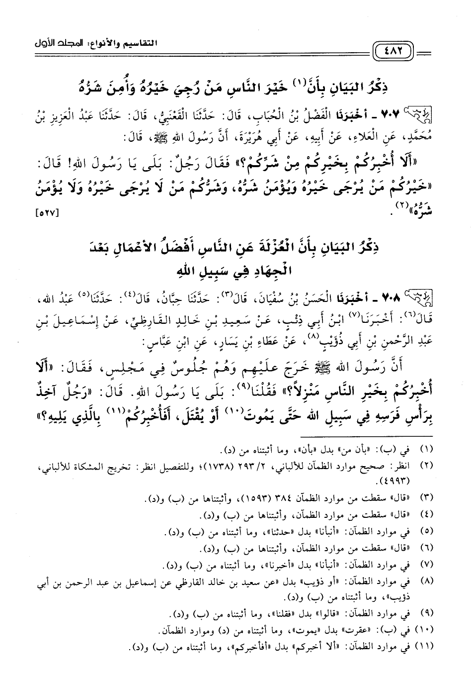 ٧٠٨ - أَخبَرنا الْحَسَنُ بْنُ سُفْيَانَ، قَالَ حَدثنا حِبَّانُ، قَالَ: حَدثنا عَبْدُ اللهِ، قَالَ: أَخبَرنا ابْنُ أَبِي ذِئْبٍ، عَنْ سَعِيدِ بْنِ خَالِدٍ الْقَارِظِيِّ، عَنْ إِسْمَاعِيلَ بْنِ عَبْدِ الرَّحْمَنِ بْنِ أَبِي ذُؤَيْبٍ، عَنْ عَطَاءِ بْنِ يَسَارٍ، عَنِ ابْنِ عَبَّاسٍ؛ أَنَّ رَسُولَ اللهِ صَلى الله عَلَيه وسَلم خَرَجَ عَلَيْهِمْ وَهُمْ جُلُوسٌ فِي مَجْلِسٍ، فقَالَ: "أَلَا أُخْبِرُكُمْ بِخَيْرِ النَّاسِ مَنْزِلاً؟ " فَقُلْنَا: بَلَى يَا رَسُولَ اللهِ، قَالَ: "رَجُلٌ آخِذٌ بِرَأْسِ فَرَسِهِ فِي سَبِيلِ اللهِ حَتَّى يموت، أَوْ يُقْتَلَ، أَفَأُخْبِرُكُمْ بِالَّذِي يَلِيهِ؟ " قُلْنَا: بَلَى يَا رَسُولَ اللهِ، قَالَ: "امْرُؤٌ مُعْتَزِلٌ فِي شِعْبٍ يُقِيمُ الصَّلَاةَ، وَيُؤْتِي الزَّكَاةَ، وَيَعْتَزِلُ شُرُورَ النَّاسِ، أَفَأُخْبِرُكُمْ بِشَرِّ النَّاسِ؟ " قُلْنَا: نَعَمْ يَا رَسُولَ اللهِ، قَالَ: "الَّذِي يُسْأَلُ بِاللهِ وَلَا يُعْطِي بِهِ". [٦٠٤]