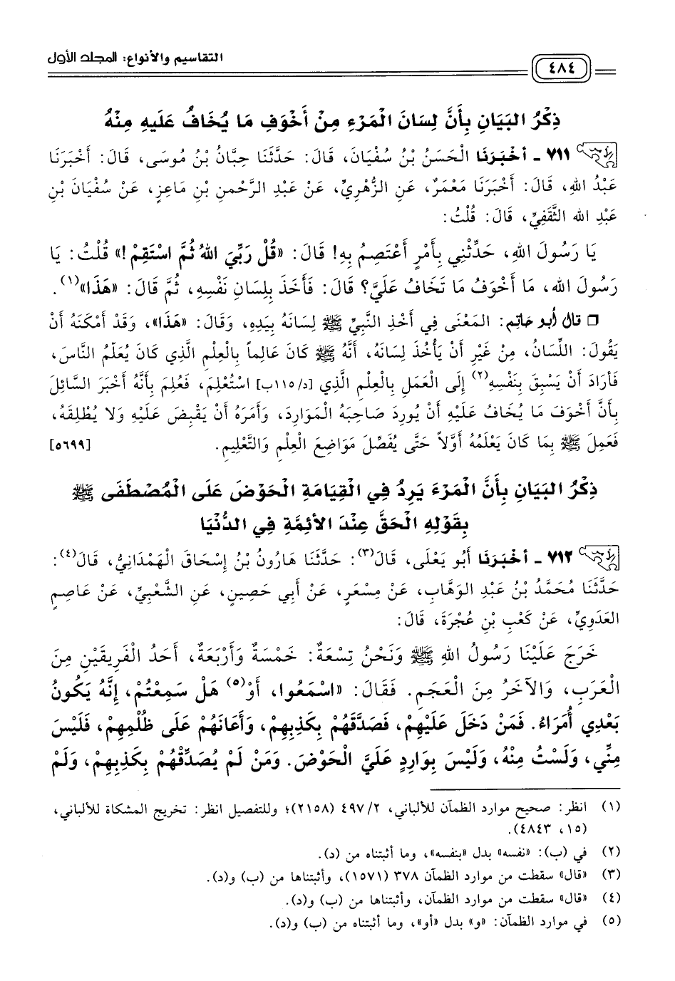 قَالَ أَبُو حَاتِمٍ: الْمَعْنَى فِي أَخْذِ النَّبِيِّ صَلى الله عَلَيه وسَلم لِسَانَهُ بِيَدِهِ وَقَالَ: "هَذَا"، وَقَدْ أَمْكَنَهُ أَنْ يَقُولَ: اللِّسَانُ مِنْ غَيْرِ أَنْ يَأْخُذَ لِسَانَهُ، أَنَّهُ صَلى الله عَلَيه وسَلم كَانَ عَالِمًا بِالْعِلْمِ الَّذِي كَانَ يُعِلِّمُ النَّاسَ، فَأَرَادَ أَنْ يَسْبِقَ بنَفْسِهِ إِلَى الْعَمَلِ بِالْعِلْمِ الَّذِي اسْتُعْلِمَ، فَعُلِمَ بِأَنَّهُ أَخْبَرَ السَّائِلَ بِأَنَّ أَخْوَفَ مَا يُخَافُ عَلَيْهِ أَنْ يُورِدَ صَاحِبَهُ الْمَوَارِدَ، وَأَمَرَهُ أَنْ يَقْبِضَ عَلَيْهِ، وَلَا يُطْلِقَهُ، فَعَمِلَ صَلى الله عَلَيه وسَلم بِمَا كَانَ يَعْلَمُهُ أَوَّلاً، حَتَّى يُفَصِّلَ مَوَاضِعَ الْعِلْمِ وَالتَّعْلِيمِ. [٥٦٩٩]