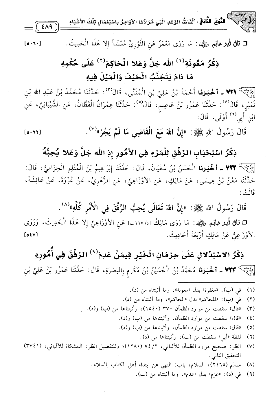قَالَ أَبُو حَاتِمٍ رَضِيَ اللهُ عَنْهُ: مَا رَوَى مَالِكٌ، عَنِ الأَوْزَاعِيِّ إِلَاّ هَذَا الْحَدِيثَ، وَرَوَى الأَوْزَاعِيُّ، عَنْ مَالِكٍ أَرْبَعَةَ أَحَادِيثَ. [٥٤٧]
