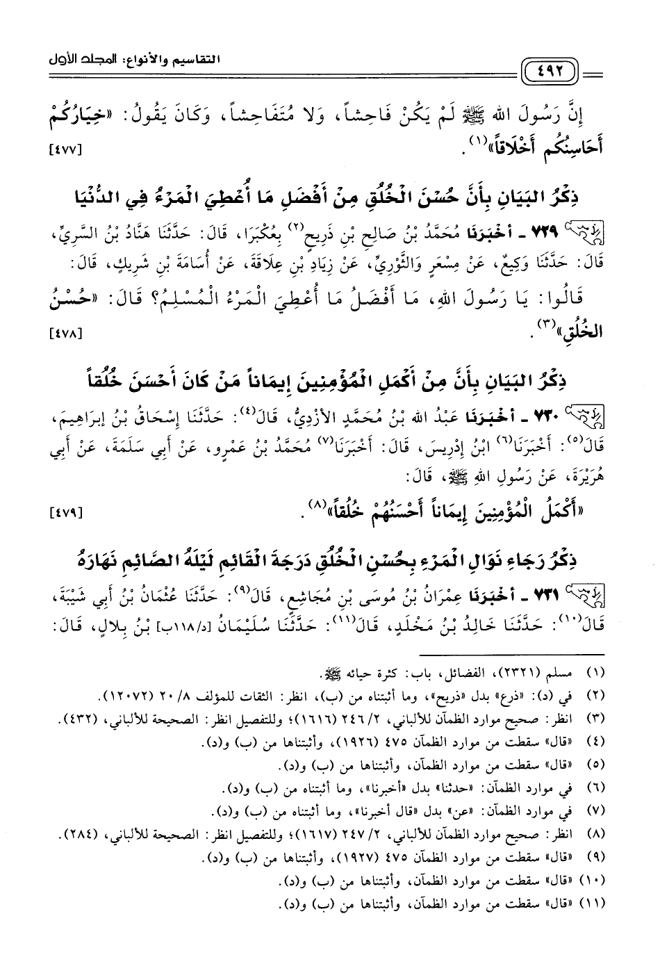٧٣٠ - أَخبَرنا عَبْدُ اللهِ بْنُ مُحَمَّدٍ الأَزْدِيُّ، قَالَ: حَدثنا إِسْحَاقُ بْنُ إِبْرَاهِيمَ، قَالَ: أَخبَرنا ابْنُ إِدْرِيسَ، قَالَ: أَخبَرنا مُحَمَّدُ بْنُ عَمْرٍو، عَنْ أَبِي سَلَمَةَ، عَنْ أَبِي هُرَيْرَةَ، عَنْ رَسُولِ اللهِ صَلى الله عَلَيه وسَلم، قَالَ: "أَكْمَلُ الْمُؤْمِنِينَ إِيمَانًا أَحْسَنُهُمْ خُلُقًا". [٤٧٩]