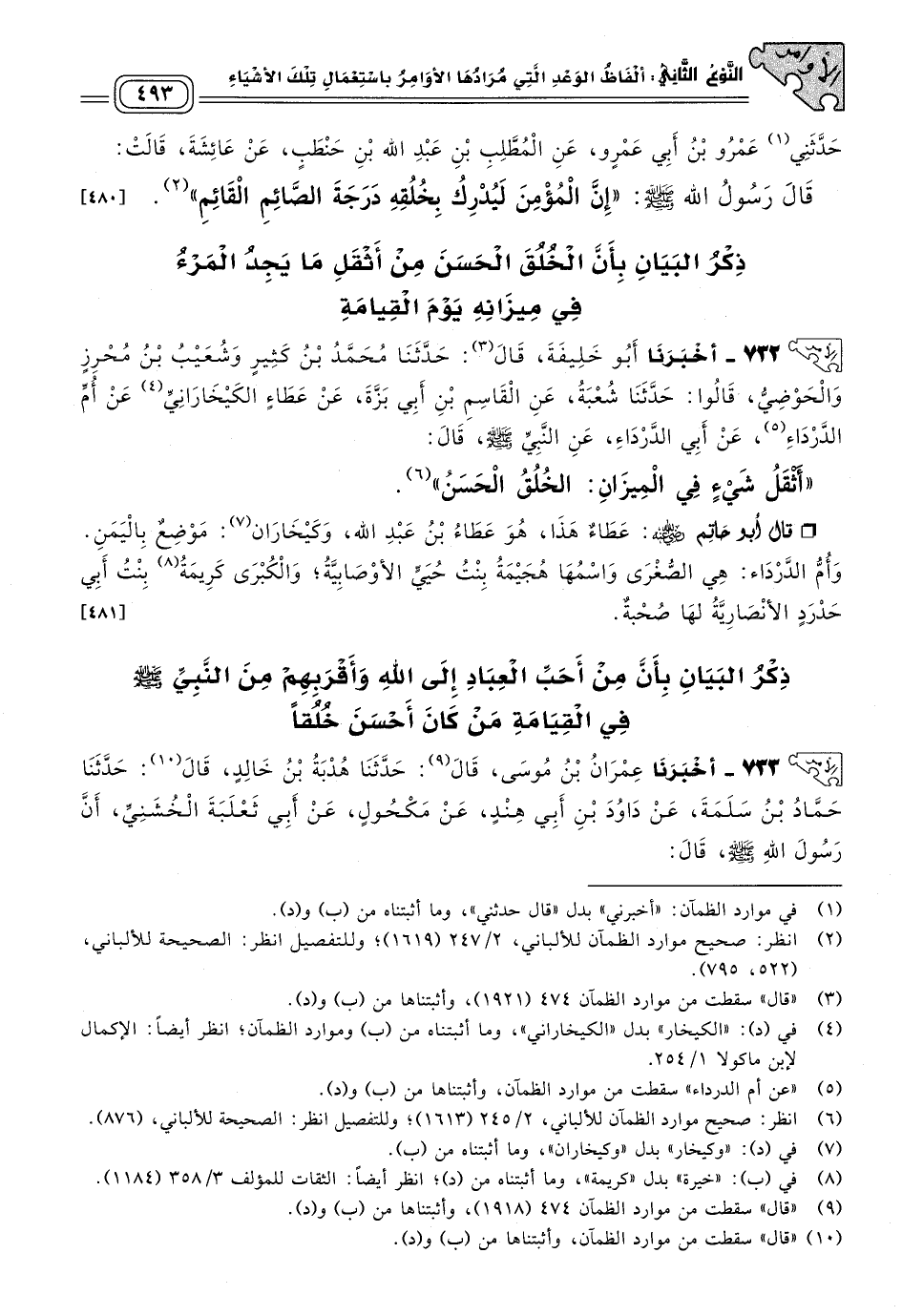 ٧٣٣ - أَخبَرنا عِمْرَانُ بْنُ مُوسَى، قَالَ: حَدثنا هُدْبَةُ بْنُ خَالِدٍ، قَالَ: حَدثنا حَمَّادُ بْنُ سَلَمَةَ، عَنْ دَاوُدَ بْنِ أَبِي هِنْدٍ، عَنْ مَكْحُولٍ، عَنْ أَبِي ثَعْلَبَةَ الْخُشَنِيِّ، أَنَّ رَسُولَ اللهِ صَلى الله عَلَيه وسَلم، قَالَ: "إِنَّ أَحَبَّكُمْ إِلَى اللهِ وَأَقْرَبَكُمْ مِنِّي أَحَاسِنُكُمْ أَخْلَاقًا، وَإِنَّ أَبْغَضَكُمْ إِلَى اللهِ وَأَبْعَدَكُمْ مِنِّي الثَّرْثَارُونَ الْمُتَفَيْهِقُونَ الْمُتَشَدِّقُونَ". [٤٨٢]