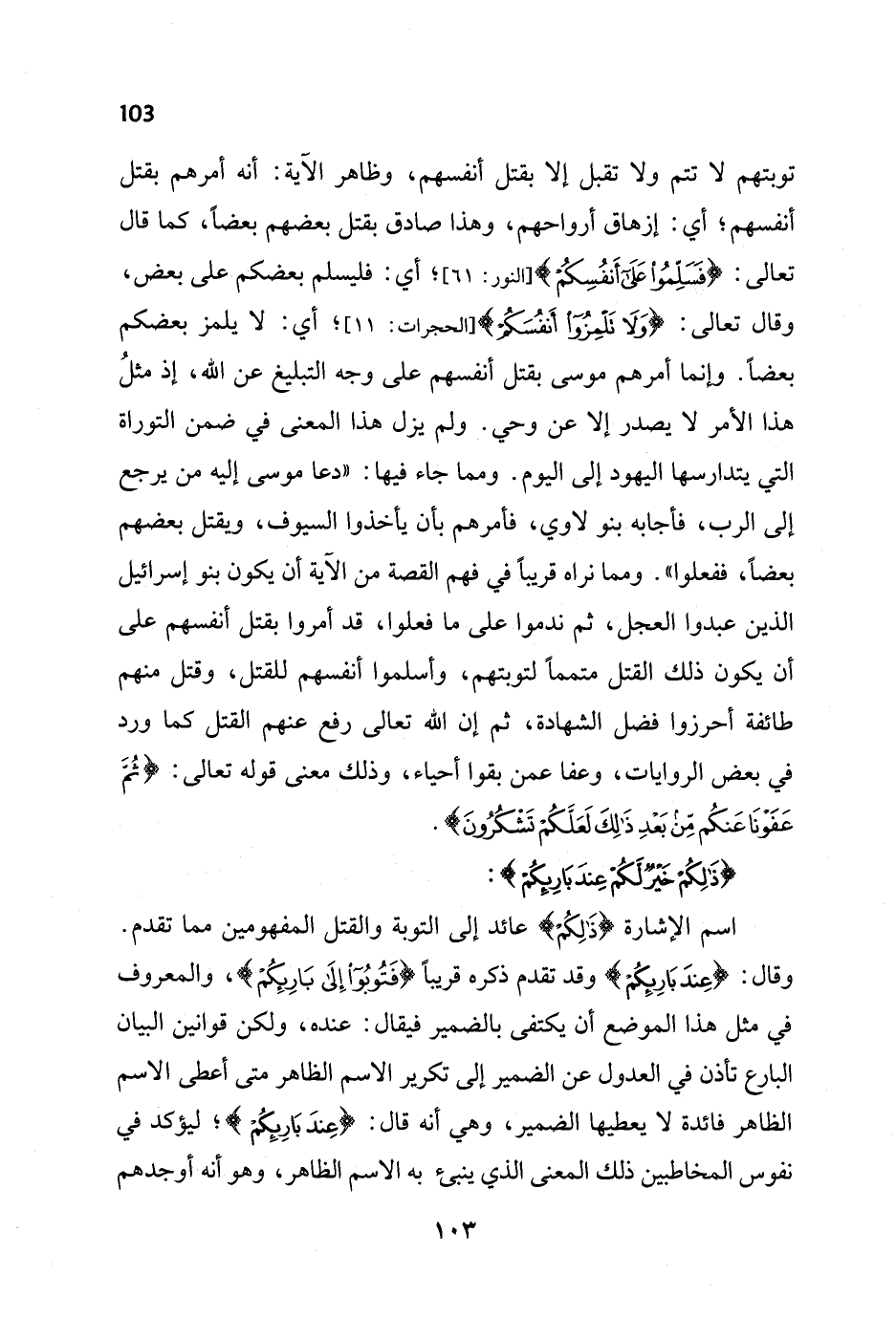 توبتهم لا تتم ولا تقبل إلا بقتل أنفسهم، وظاهر الآية: أنه أمرهم بقتل أنفسهم؛ أي: إزهاق أرواحهم، وهذا صادق بقتل بعضهم بعضاً، كما قال تعالى: {فَسَلِّمُوا عَلَى أَنْفُسِكُمْ} [النور: 61]؛ أي: فليسلم بعضكم على بعض، وقال تعالى: {وَلَا تَلْمِزُوا أَنْفُسَكُمْ} [الحجرات: 11]؛ أي: لا يلمز بعضكم بعضاً. وإنما أمرهم موسى بقتل أنفسهم على وجه التبليغ عن الله، إذ مثلُ هذا الأمر لا يصدر إلا عن وحي. ولم يزل هذا المعنى في ضمن التوراة التي يتدارسها اليهود إلى اليوم. ومما جاء فيها: "دعا موسى إليه من يرجع إلى الرب، فأجابه بنو لاوي، فأمرهم بأن يأخذوا السيوف، ويقتل بعضهم بعضاً، ففعلوا". ومما نراه قريباً في فهم القصة من الآية أن يكون بنو إسرائيل الذين عبدوا العجل، ثم ندموا على ما فعلوا، قد أمروا بقتل أنفسهم على أن يكون ذلك القتل متمماً لتوبتهم، وأسلموا أنفسهم للقتل، وقتل منهم طائفة أحرزوا فضل الشهادة، ثم إن الله تعالى رفع عنهم القتل كما ورد في بعض الروايات، وعفا عمن بقوا أحياء، وذلك معنى قوله تعالى: