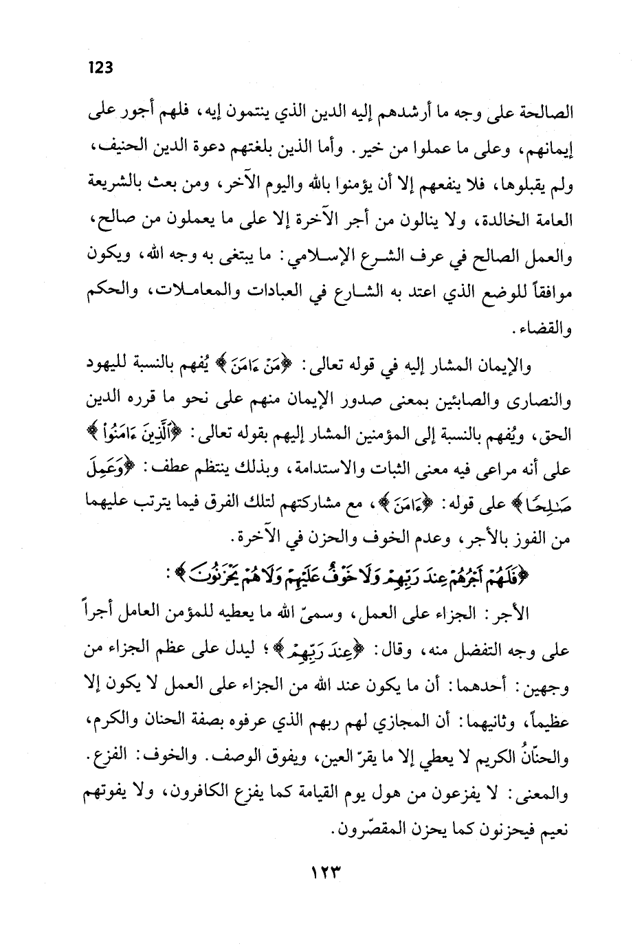 الصالحة على وجه ما أرشدهم إليه الدين الذي ينتمون إيه، فلهم أجور على إيمانهم، وعلى ما عملوا من خير. وأما الذين بلغتهم دعوة الدين الحنيف، ولم يقبلوها، فلا ينفعهم إلا أن يؤمنوا بالله واليوم الآخر، ومن بعث بالشريعة العامة الخالدة، ولا ينالون من أجر الآخرة إلا على ما يعملون من صالح، والعمل الصالح في عرف الشرع الإسلامي: ما يبتغى به وجه الله، ويكون موافقاً للوضع الذي اعتد به الشارع في العبادات والمعاملات، والحكم والقضاء.