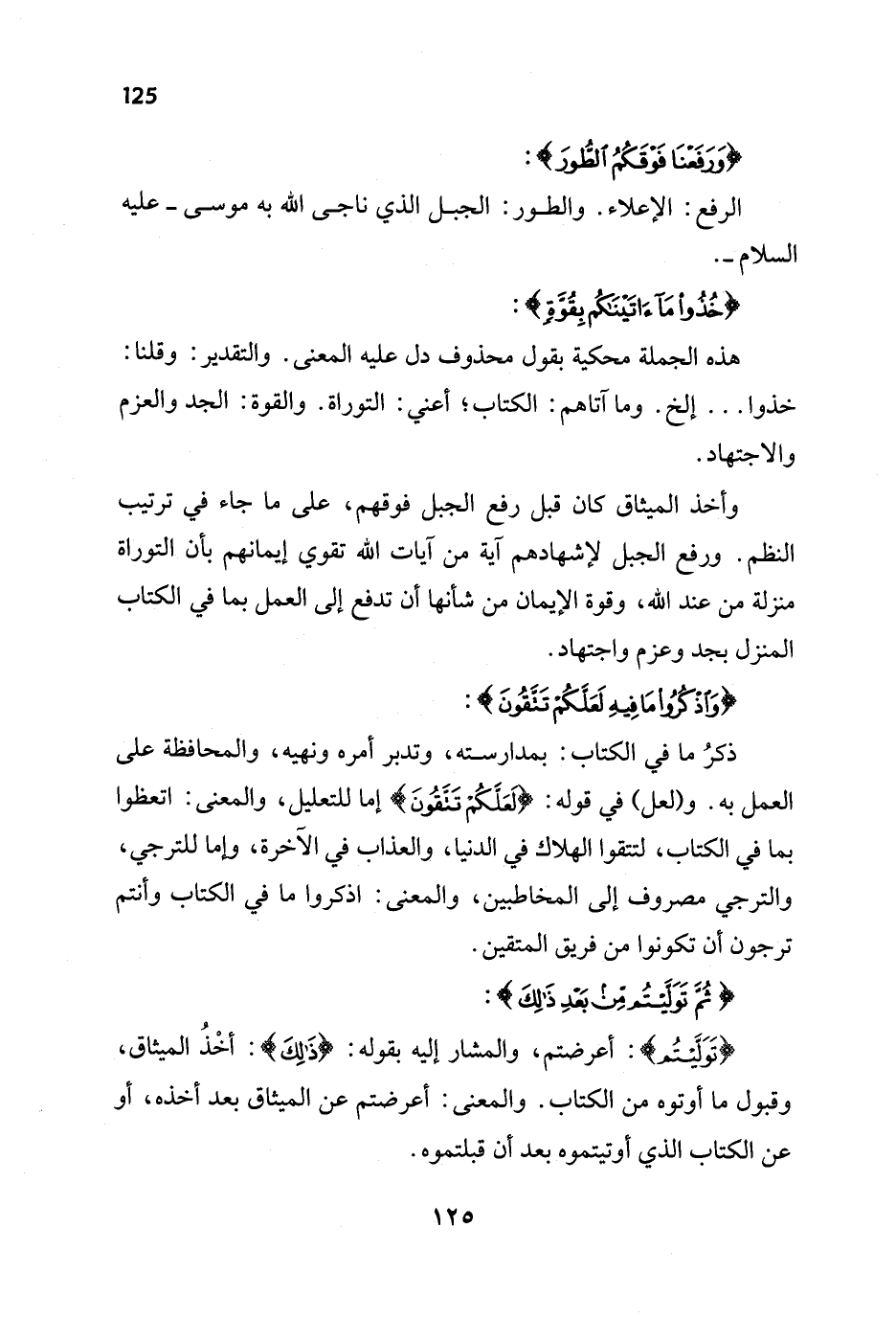 وأخذ الميثاق كان قبل رفع الجبل فوقهم، على ما جاء في ترتيب النظم. ورفع الجبل لإشهادهم آية من آيات الله تقوي إيمانهم بأن التوراة منزلة من عند الله، وقوة الإيمان من شأنها أن تدفع إلى العمل بما في الكتاب المنزل بجد وعزم واجتهاد.
