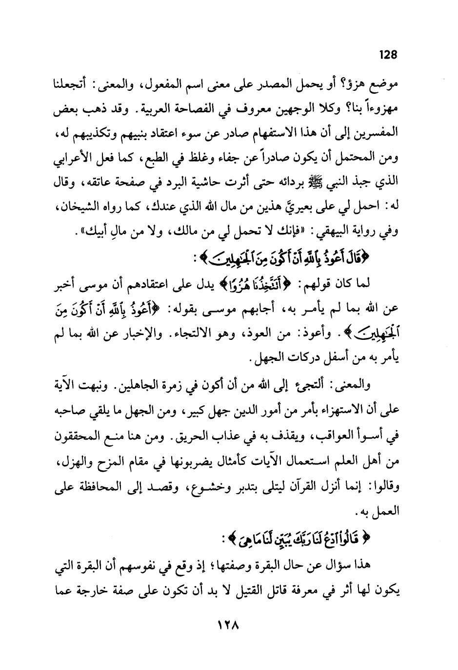 والمعنى: ألتجئ إلى الله من أن كون في زمرة الجاهلين. ونبهت الآية على أن الاستهزاء بأمر من أمور الدين جهل كبير، ومن الجهل ما يلقي صاحبه في أسوأ العواقب، ويقذف به في عذاب الحريق. ومن هنا منع المحققون من أهل العلم استعمال الآيات كأمثال يضربونها في مقام المزح والهزل، وقالوا: إنما أنزل القرآن ليتلى بتدبر وخشوع، وقصد إلى المحافظة على العمل به.