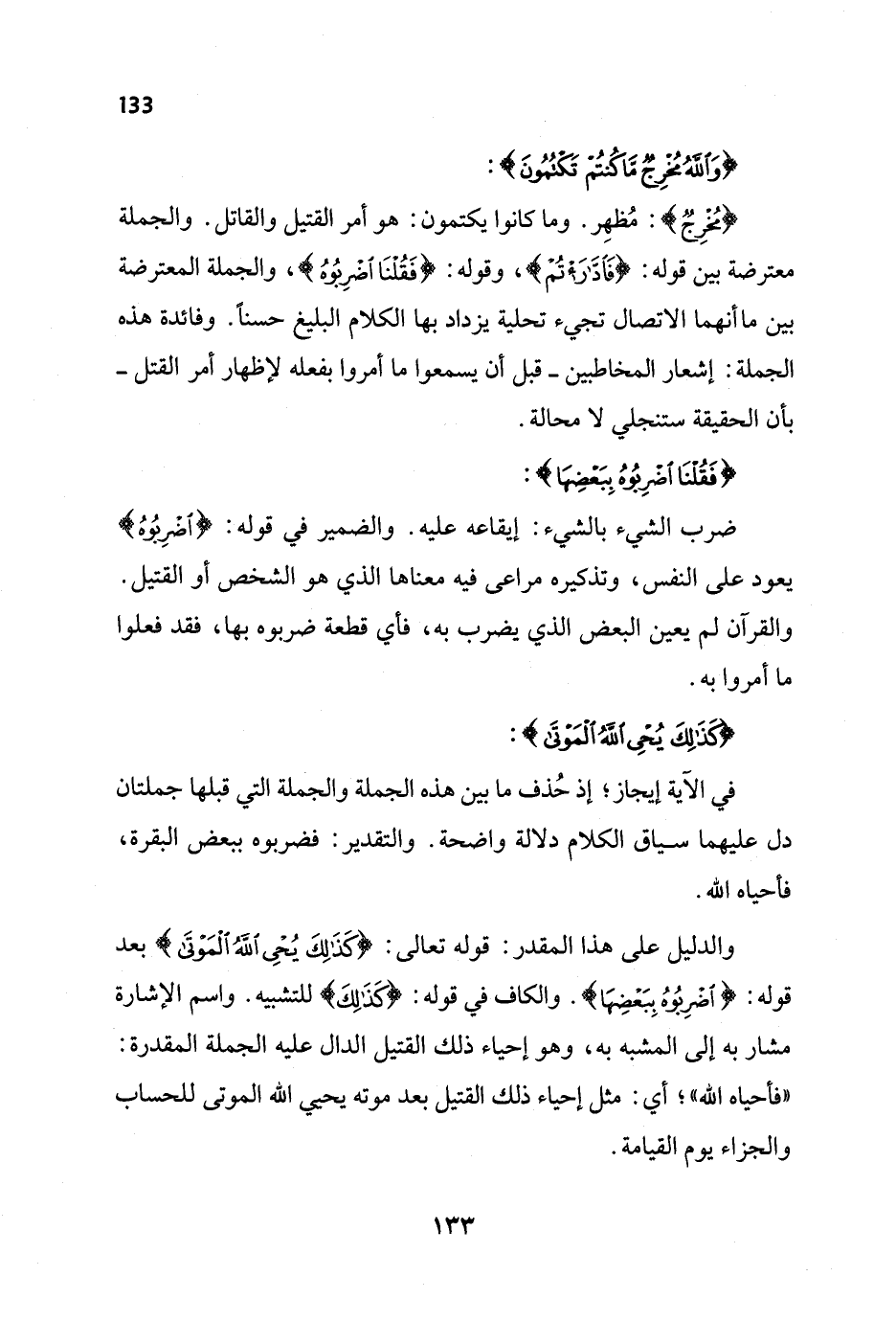 والدليل على هذا المقدر: قوله تعالى: {كَذَلِكَ يُحْيِ اللَّهُ الْمَوْتَى} بعد قوله: {اضْرِبُوهُ بِبَعْضِهَا}. والكاف في قوله: {كَذَلِكَ} للتشبيه. واسم الإشارة مشار به إلى المشبه به، وهو إحياء ذلك القتيل الدال عليه الجملة المقدرة: "فأحياه الله"؛ أي: مثل إحياء ذلك القتيل بعد موته يحيى الله الموتى للحساب والجزاء يوم القيامة.