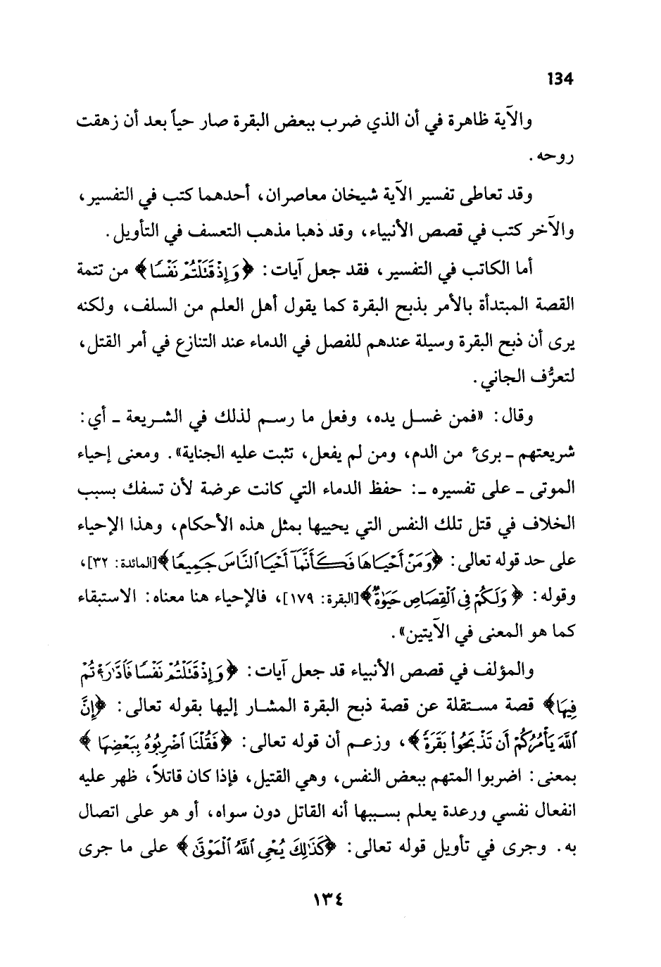 وقال: "فمن غسل يده، وفعل ما رسم لذلك في الشريعة - أي: شريعتهم- برئ من الدم، ومن لم يفعل، تثبت عليه الجناية". ومعنى إحياء الموتى-على تفسيره-: حفظ الدماء التي كانت عرضة لأن تسفك بسبب الخلاف في قتل تلك النفس التي يحييها بمثل هذه الأحكام، وهذا الإحياء على حد قوله تعالى {وَمَنْ أَحْيَاهَا فَكَأَنَّمَا أَحْيَا النَّاسَ جَمِيعًا} [المائدة: 32]، وقوله: {وَلَكُمْ فِي الْقِصَاصِ حَيَاةٌ} [البقرة: 179]، فالإحياء هنا معناه: الاستبقاء كما هو المعنى في الآيتين". والمؤلف في قصص الأنبياء قد جعل آيات: {وَإِذْ قَتَلْتُمْ نَفْسًا فَادَّارَأْتُمْ فِيهَا} قصة مستقلة عن قصة ذبح البقرة المشار إليها بقوله تعالى: {إِنَّ اللَّهَ يَأْمُرُكُمْ أَنْ تَذْبَحُوا بَقَرَةً}، وزعم أن قوله تعالى: {فَقُلْنَا اضْرِبُوهُ بِبَعْضِهَا} بمعنى: اضربوا المتهم ببعض النفس، وهي القتيل، فإذا كان قاتلاً، ظهر عليه انفعال نفسي ورعدة يعلم بسببها أنه القاتل دون سواه، أو هو على اتصال به. وجرى في تأويل قوله تعالى: {كَذَلِكَ يُحْيِ اللَّهُ الْمَوْتَى} على ما جرى