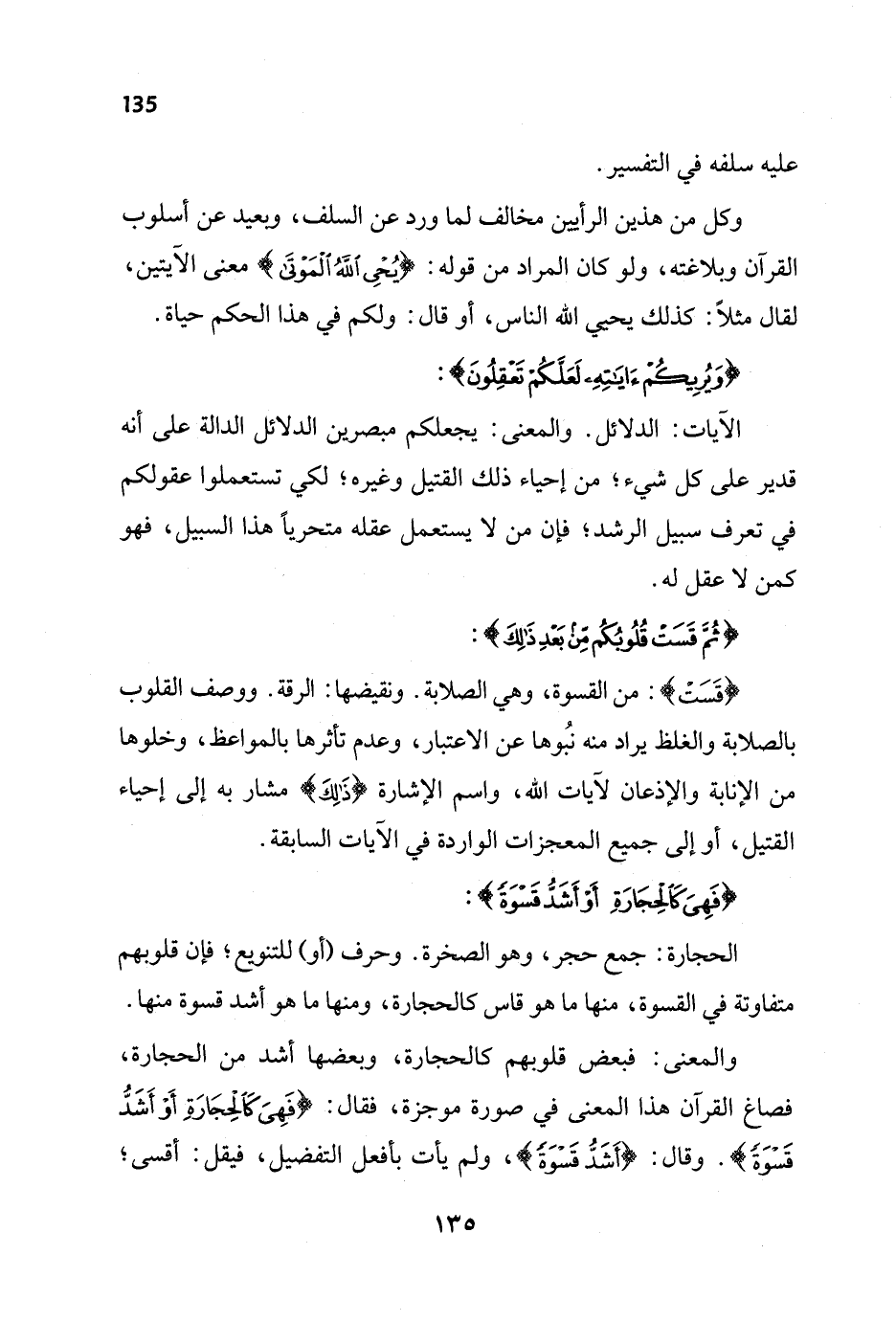وكل من هذين الرأيين مخالف لما ورد عن السلف، وبعيد عن أسلوب القرآن وبلاغته، ولو كان المراد من قوله: {يُحْيِ اللَّهُ الْمَوْتَى} معنى الآيتين، لقال مثلاً: كذلك يحيي الله الناس، أو قال: ولكم في هذا الحكم حياة.